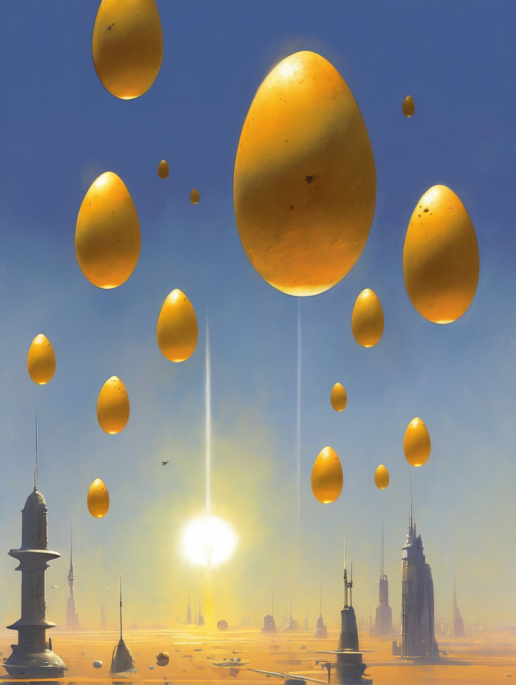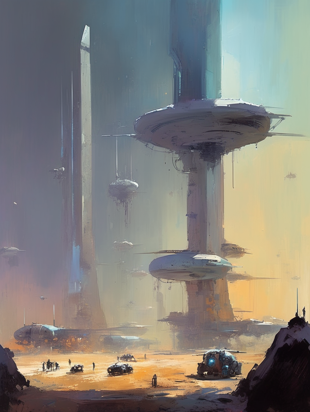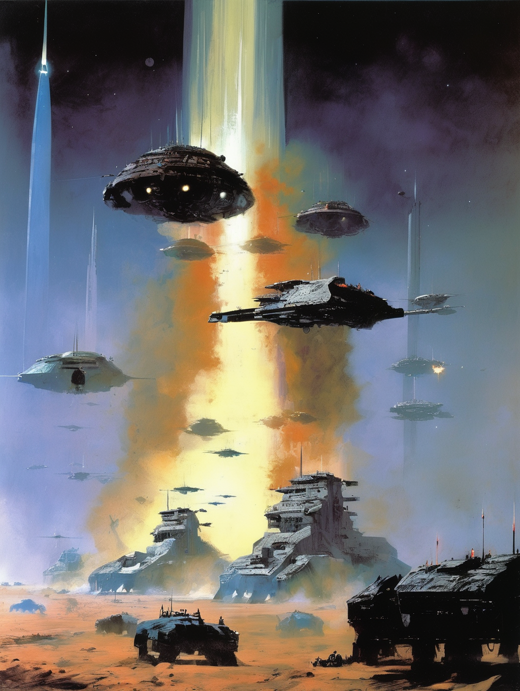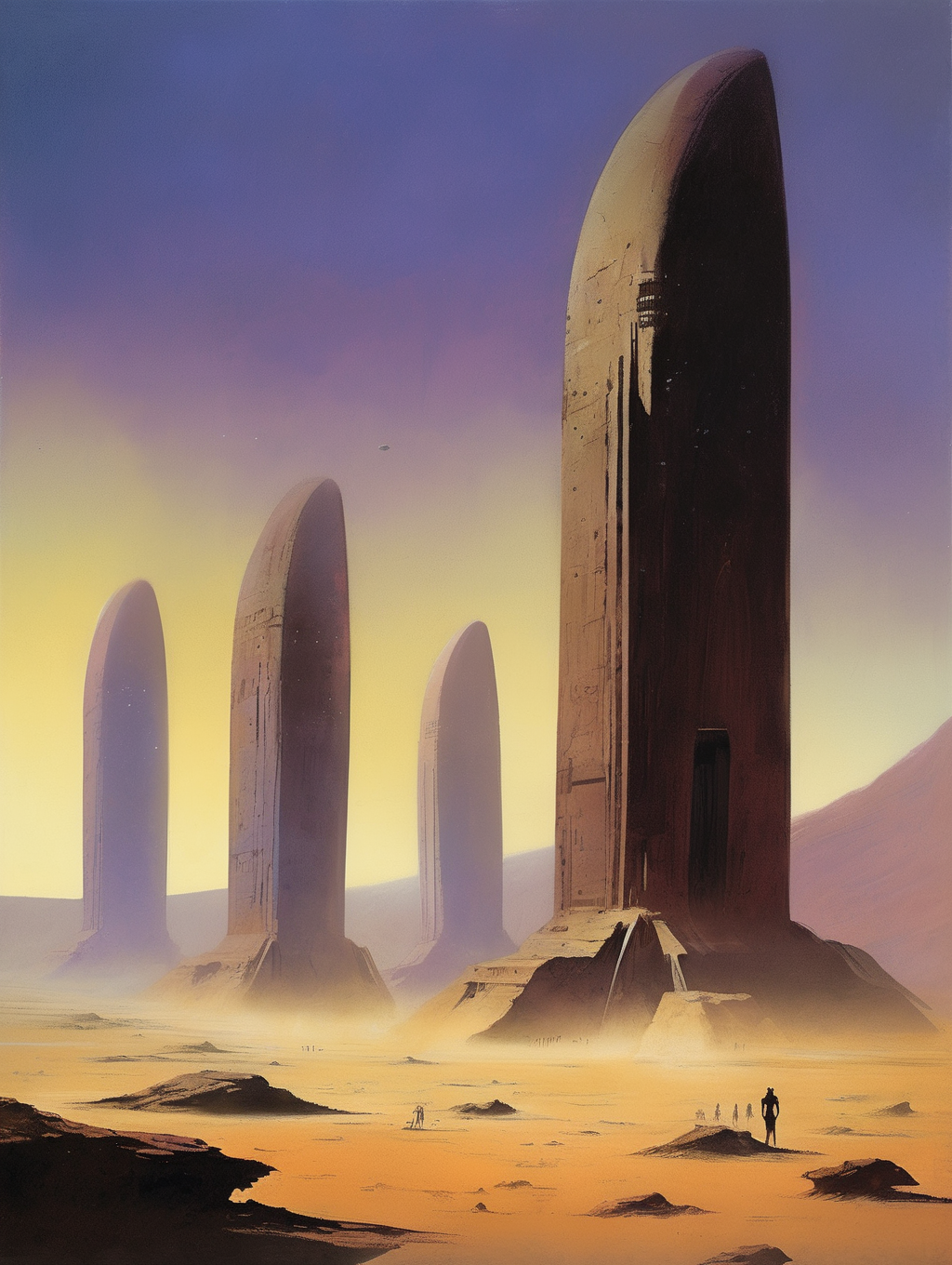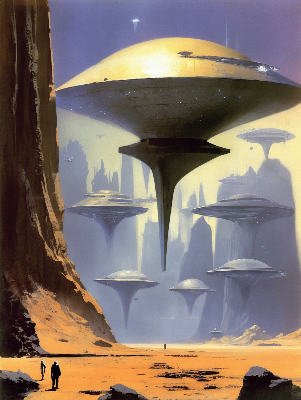 His style can be described as atmospheric and epic, often featuring vast alien landscapes, futuristic cities, and fantastical scenes.