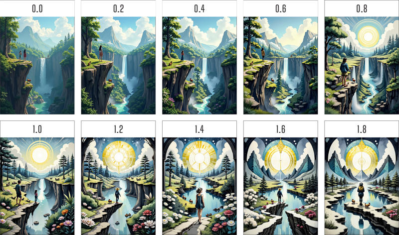 Artistic cosmic retro painting styletrigger: c0smicRet7ostrength effect on simple prompt:"c0smicRet7o art style, Woman standing on a high cliff edge, looking at the amazing nature landscape view, forest animals by the waterfall, sunny dreamy day"