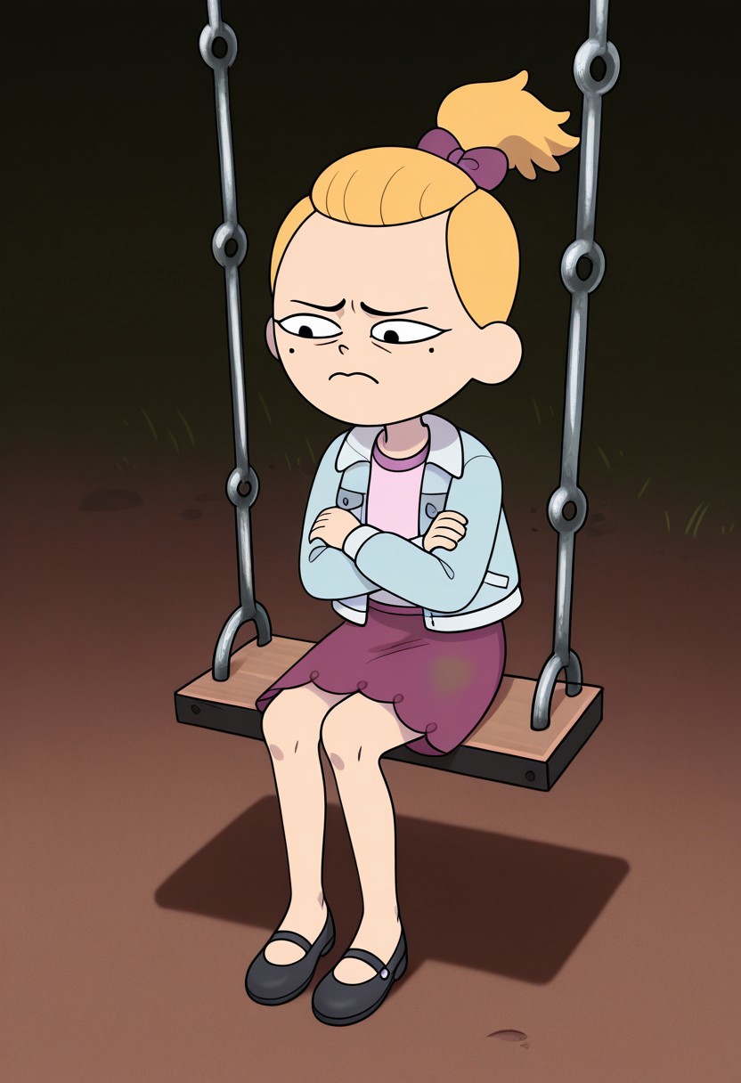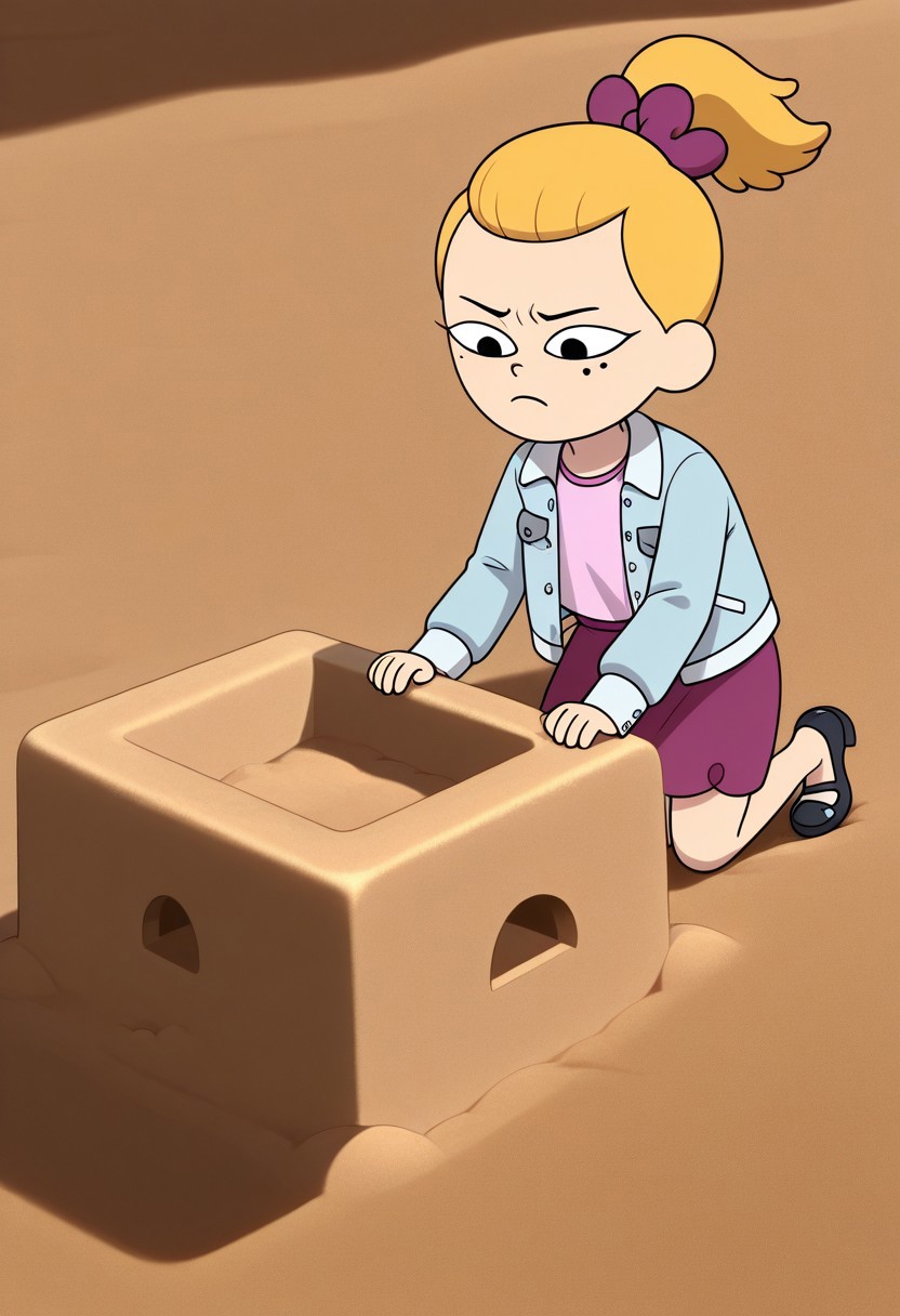Sasha, 1girl, alone, short stature, blonde hair tied in a ponytail with a dark pink bow, mole on left cheek, light blue jacket, light pink shirt, dark pink skirt, black strap shoes