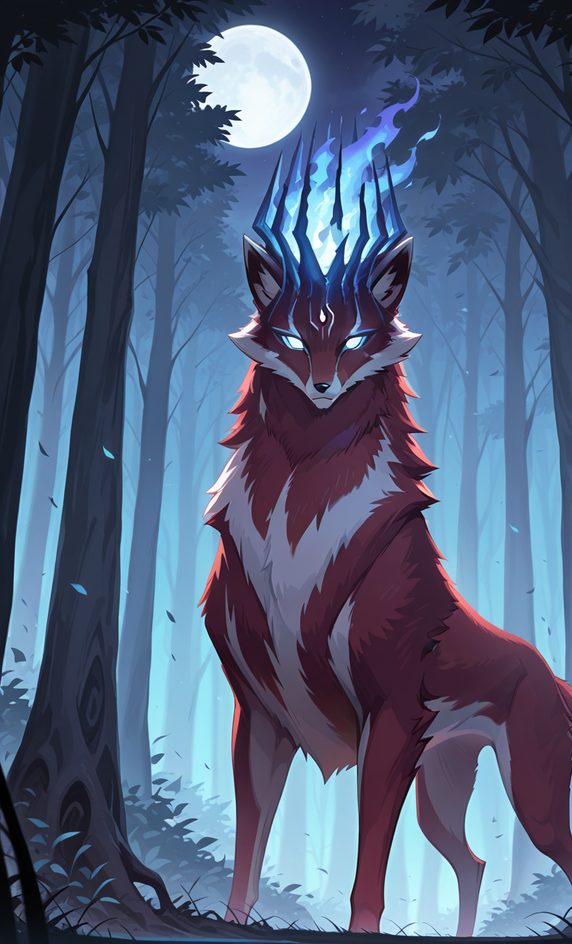 Sai'nen_Thousand-Tailed, giant, fox, feral, no hair, two-tone fur, red and white fur, crown coming out of the head, high crown, crown with blue fire, glowing eyes, light blue eyes, no pupils, eight tails,