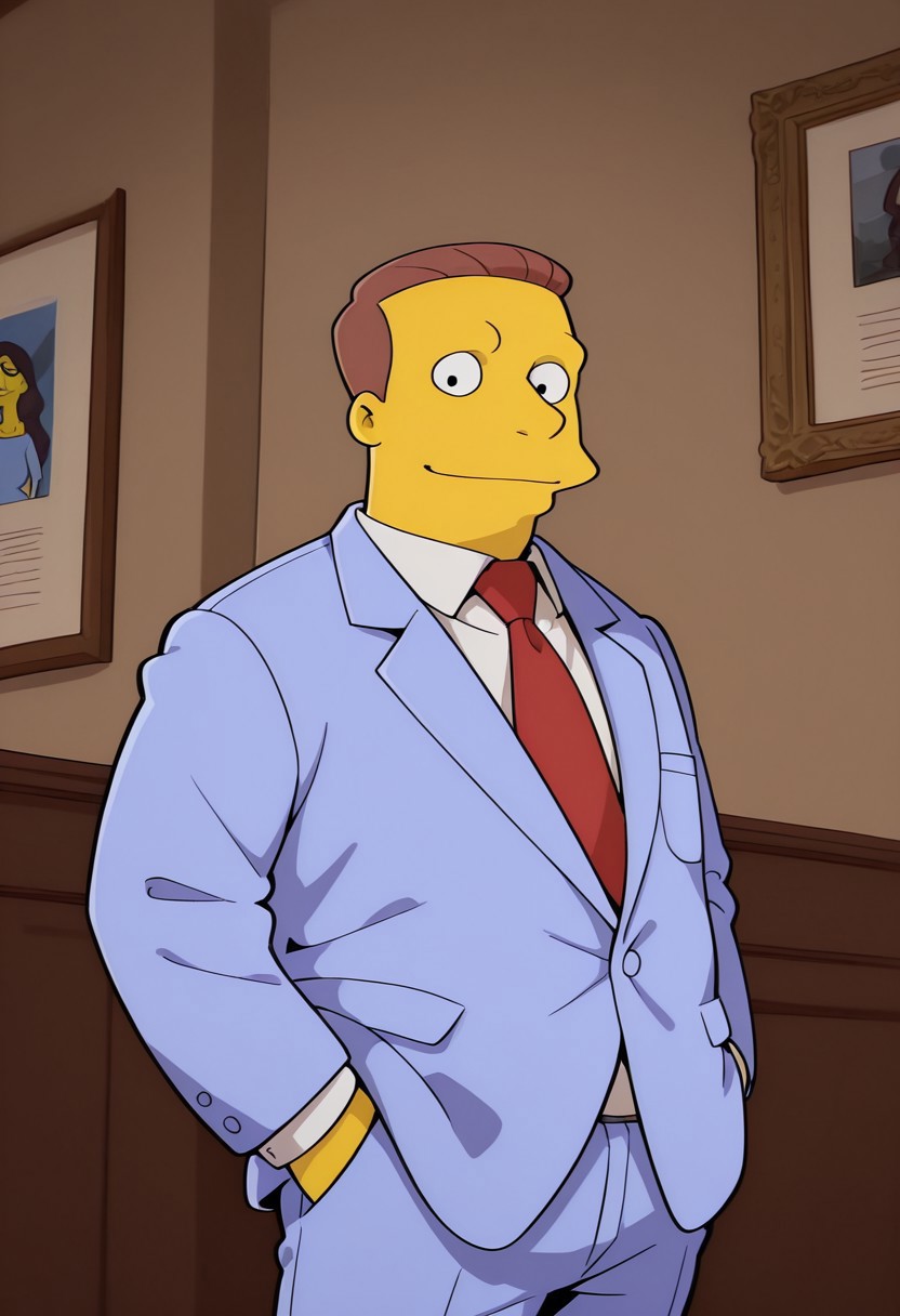 Lionel, 1man, male, mature male, yellow skin, stocky, brown hair, no eyebrows, black eyes, round ears, light blue suit, white collared shirt, red necktie, light blue dress pants, black dress shoes,