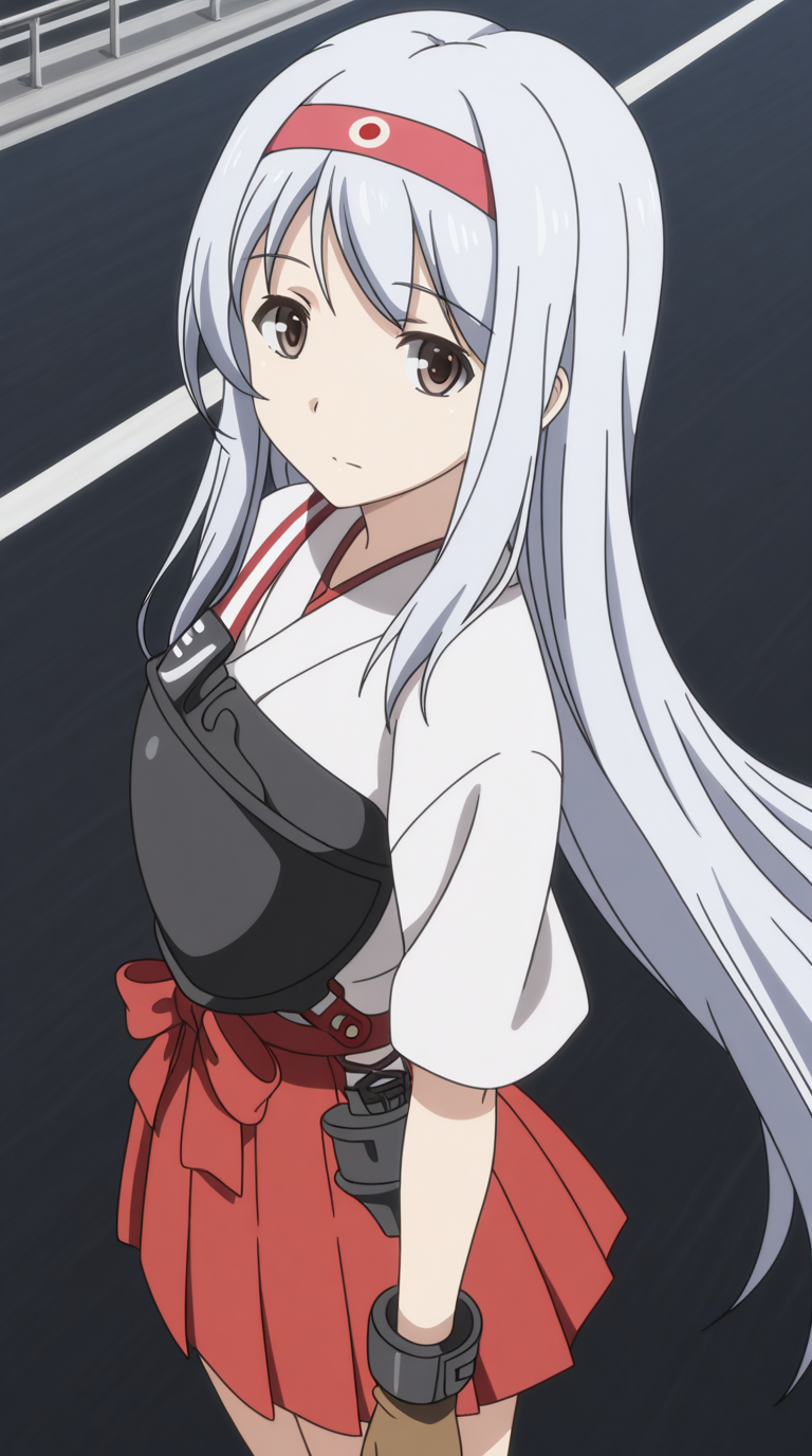 shoukaku, shoukaku (kancolle), long hair, brown eyes, white hair, grey hair, hairband, headband, mature female, small breast, anime screencap