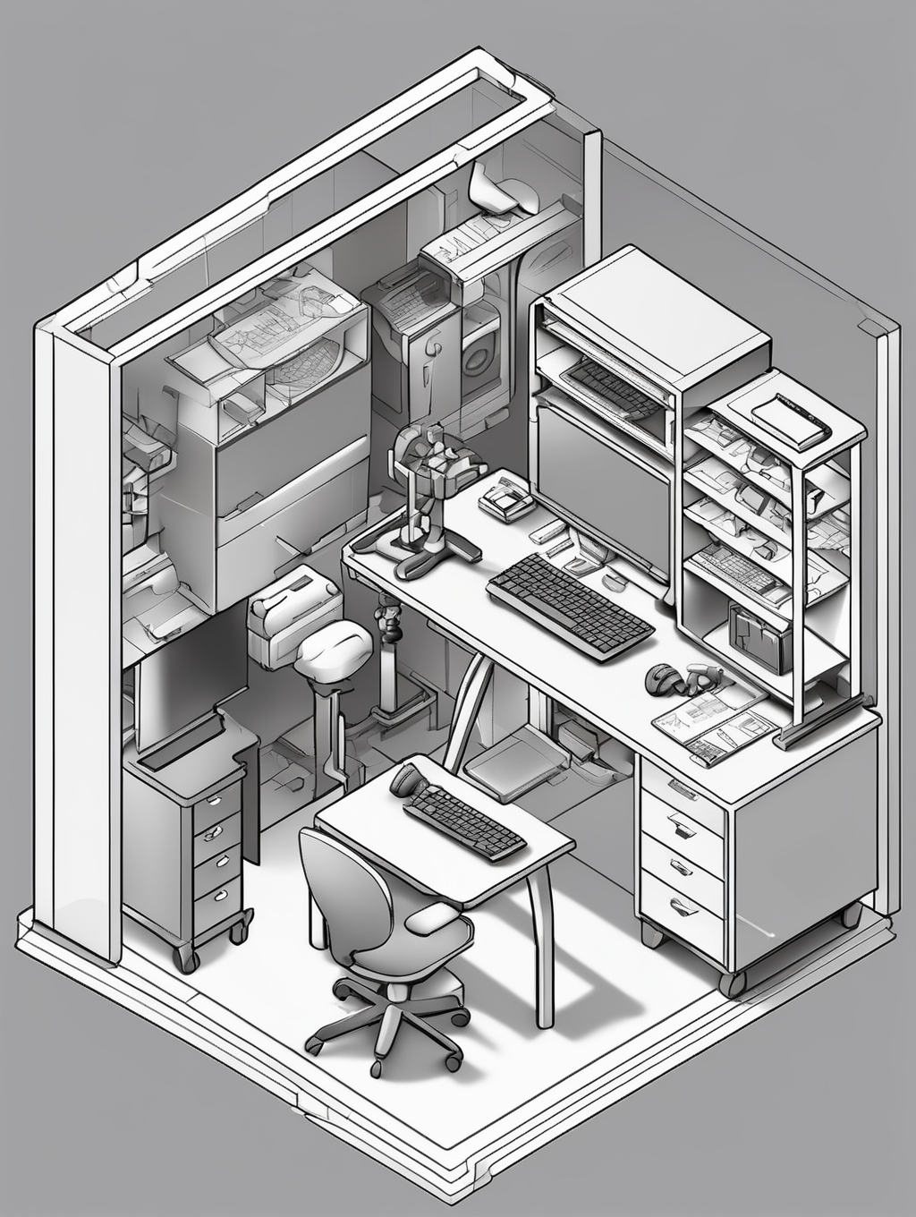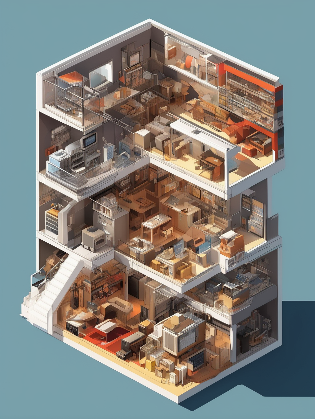 Isometric cutaway illustrations are commonly used in technical and architectural drawings, product design, and visualizations of complex systems or machinery. They allow viewers to understand the internal structure or mechanisms of an object while maintaining a clear understanding of its external form.