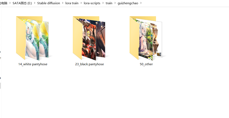NAi上训练 7e-5/7e-5/8e-6 1280x1280分辨率 63张图 6000多步 epoch10 batchsize2 三个概念文件夹 分别是others /white pantyhose /black pantyhose
