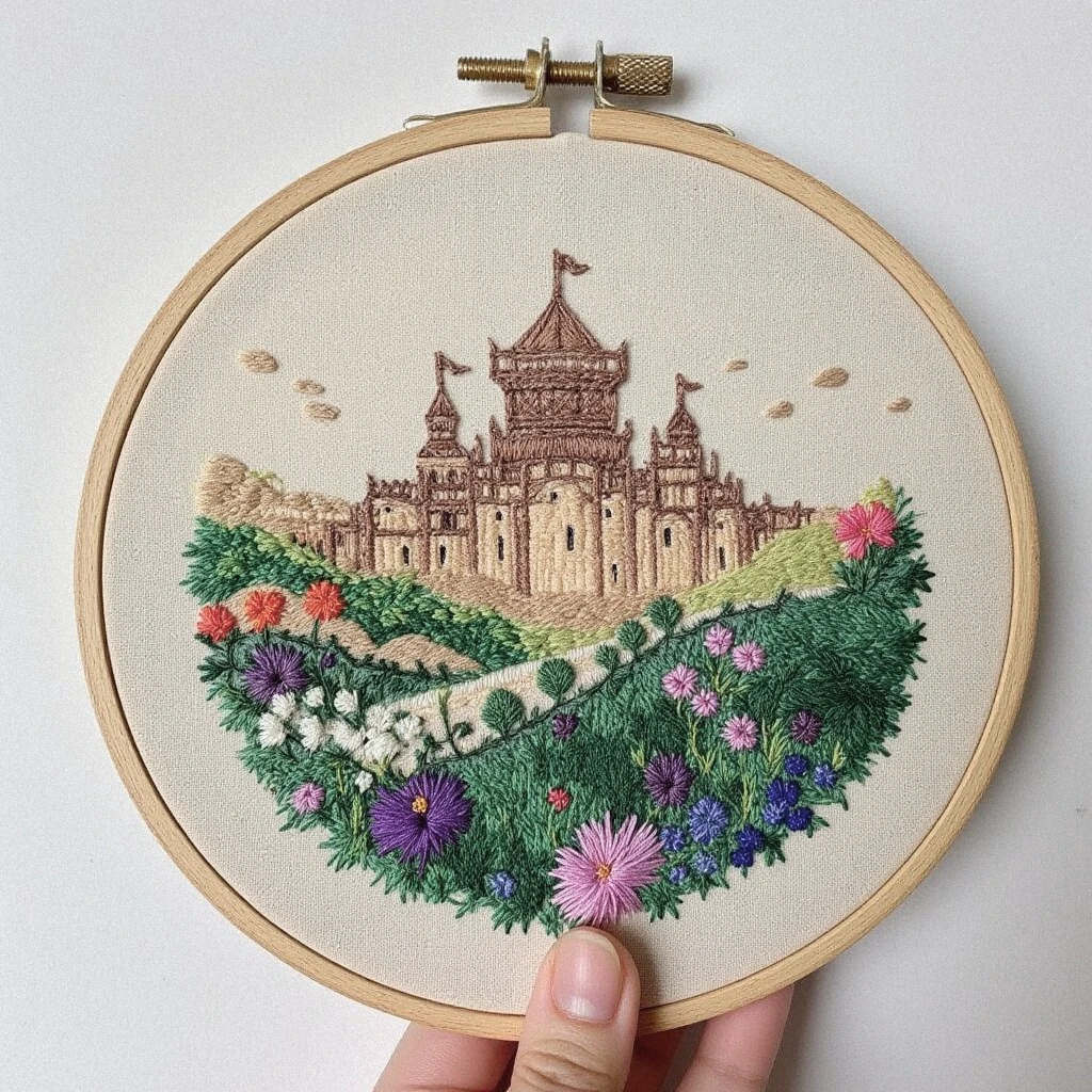 A custom LoRA trained on various embroidered art on linen cloth on circular panels.