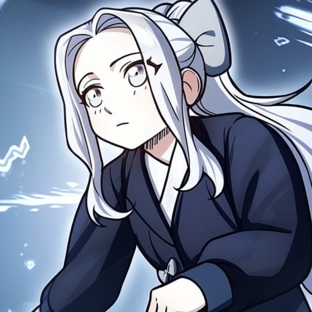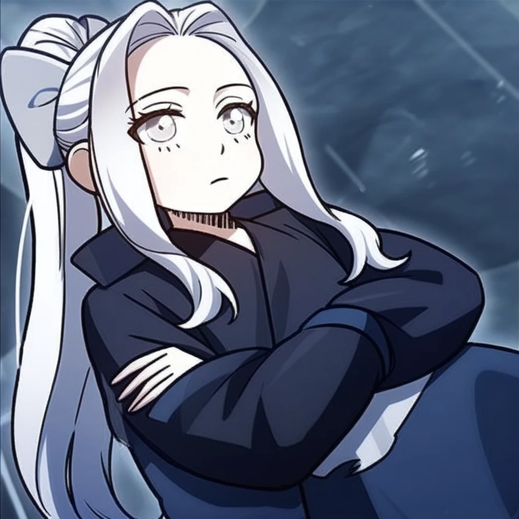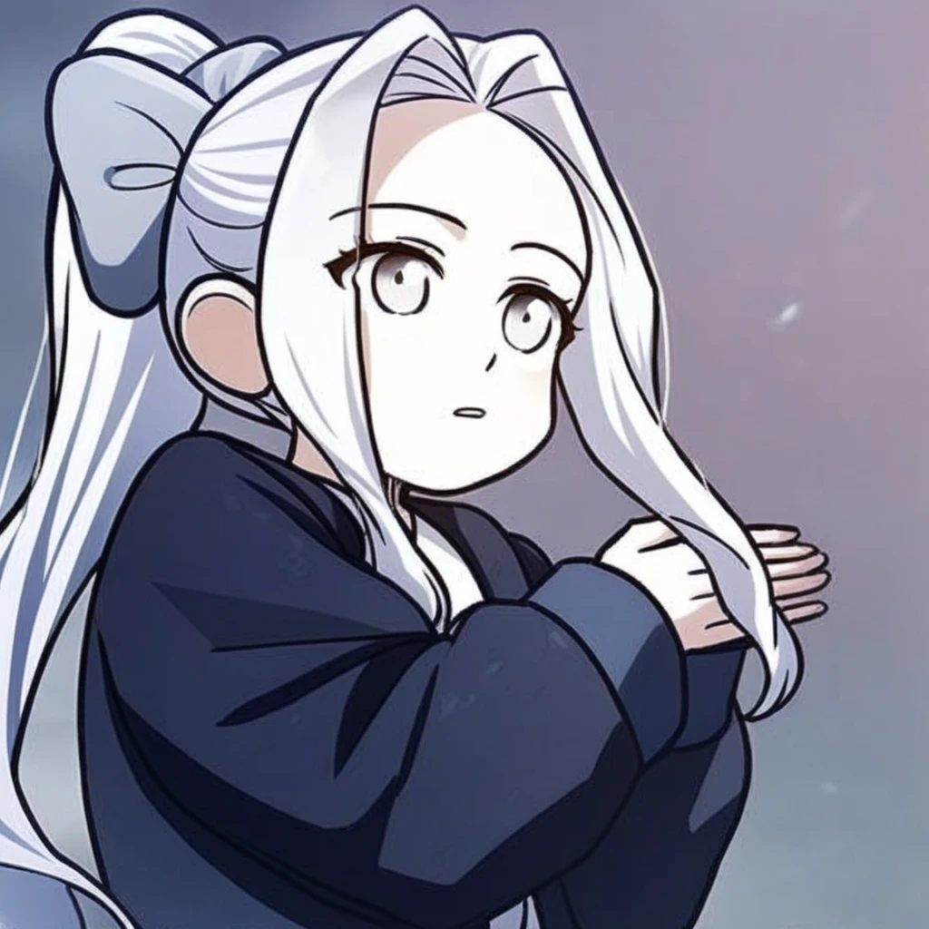 long hair, long sleeves, jacket, ponytail, white hair, hair bow, grey eyes, hair bow