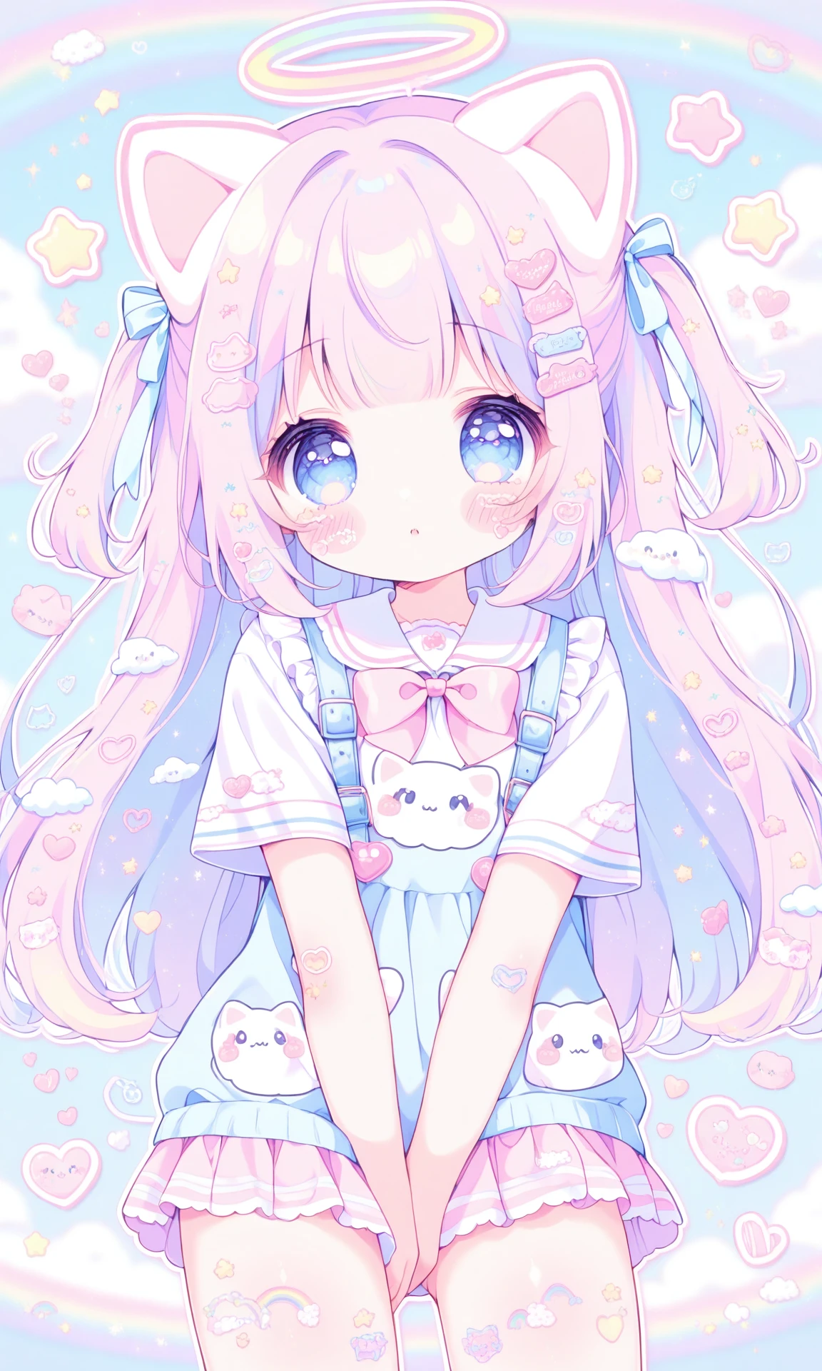 cutecore edit, (pastel colors), blurry, blurry background, blurred outlines, soft, (stickers), ((drawn on stickers)), drawn on blush, drawn on halo, drawn on cat ears, flower stickers, hearts, stars, rainbows, clouds, cute kitten stickers, cute puppy stickers, cute rabbit stickers, cute food stickers, cakes, cupcakes, ice cream, cute Sanrio characters, Hello Kitty, My Melody, Kuromi, text, text captions, English text, Japanese text, pastel border frame