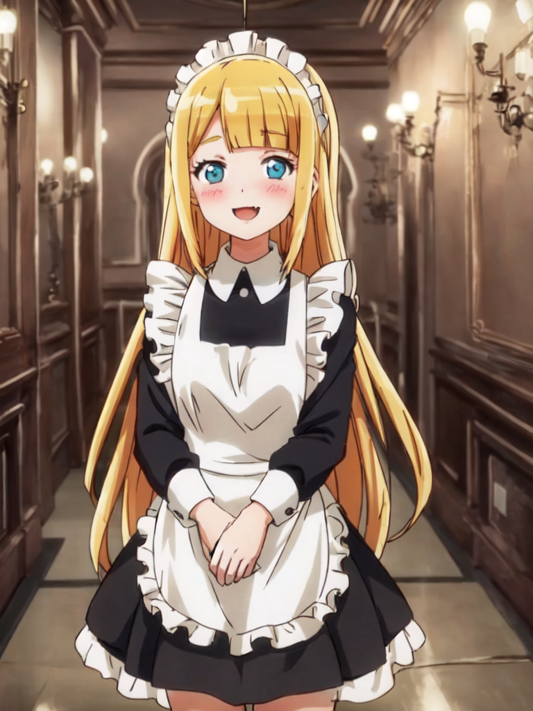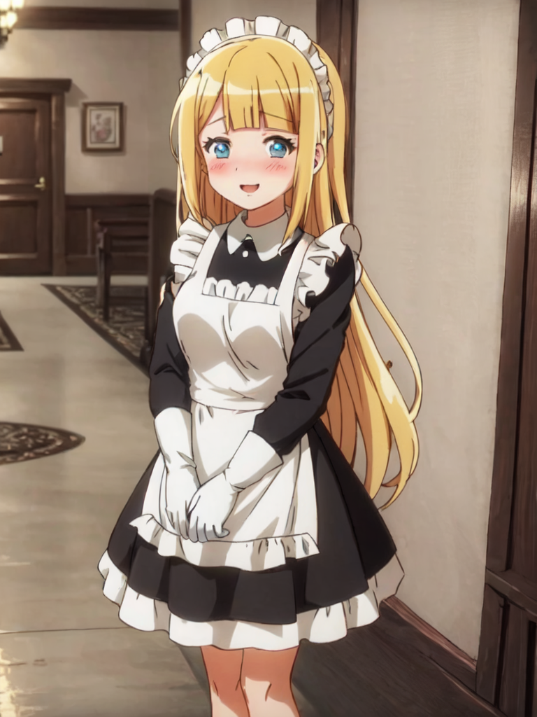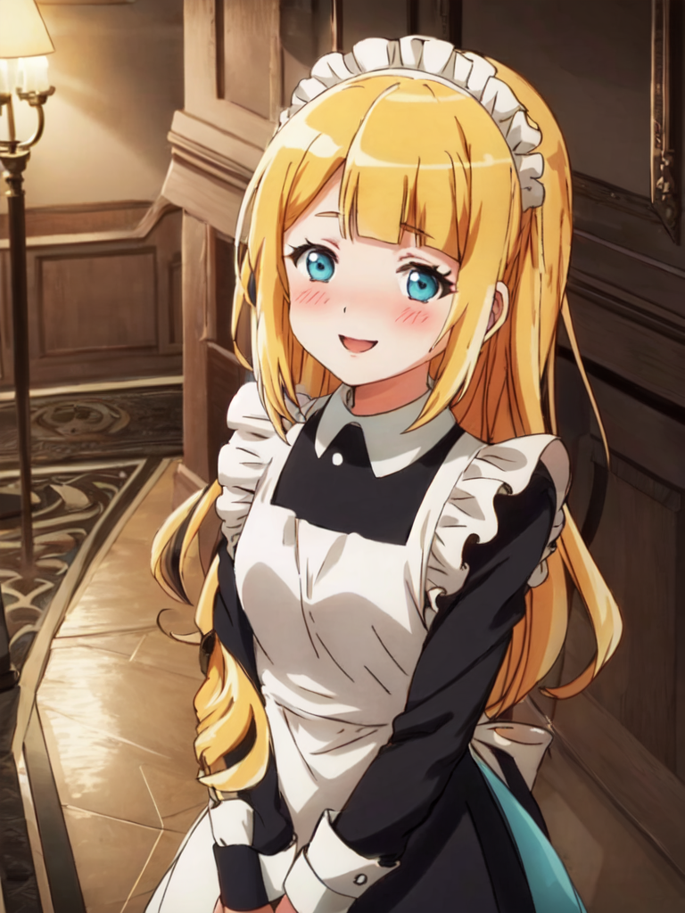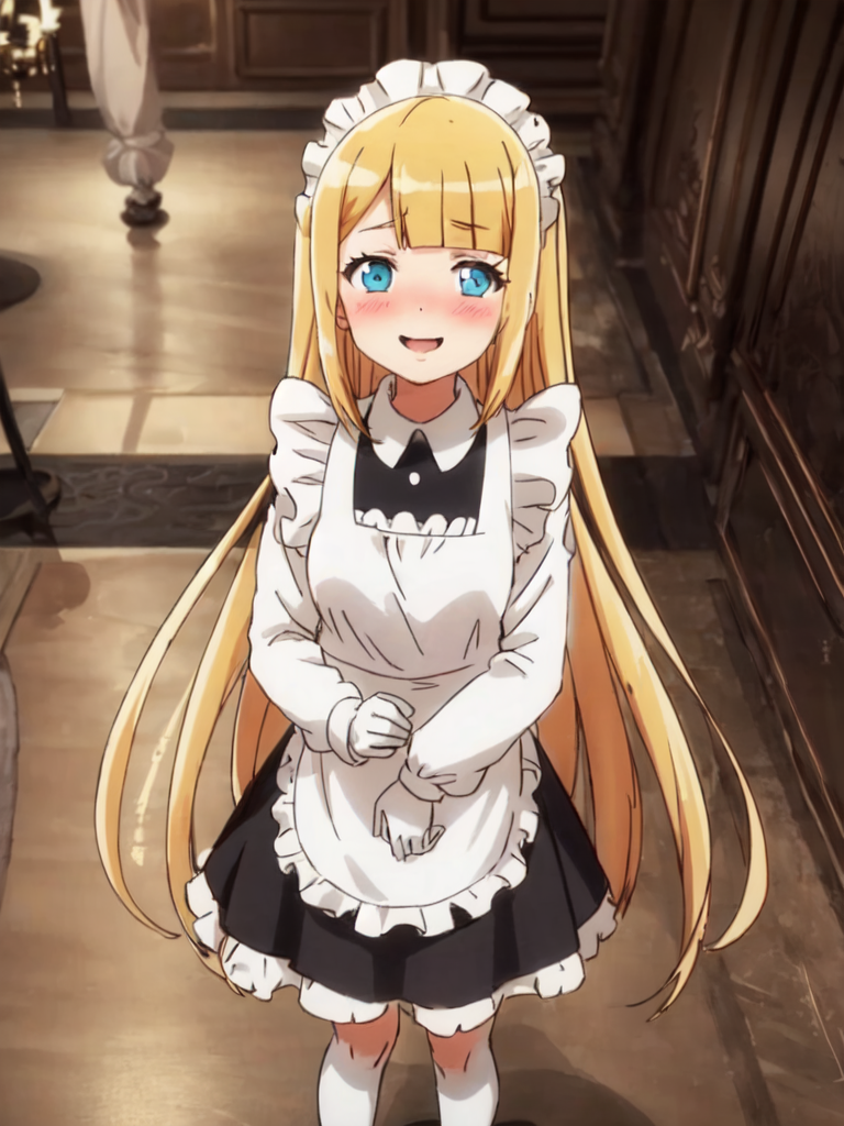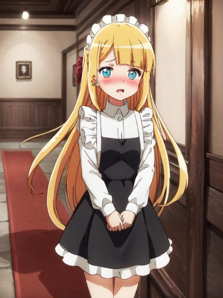 tuare <lora:tuareninya:0.7> cute kawaii 1girl 14yo blond hair straight hair long hair blunt bangs sidelock, turquoise eyes, small breasts, (troubled eyebrows:0.6) (squinting eyes:1.4) smile embarrassed nose blush:1.8 maid long sleeve blouse black long skirt white apron maid headdress white socks shoes white glove Aristocratic mansion entrance chandelier Portrait of an old man