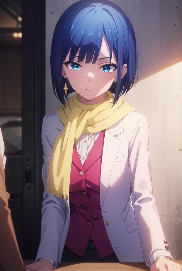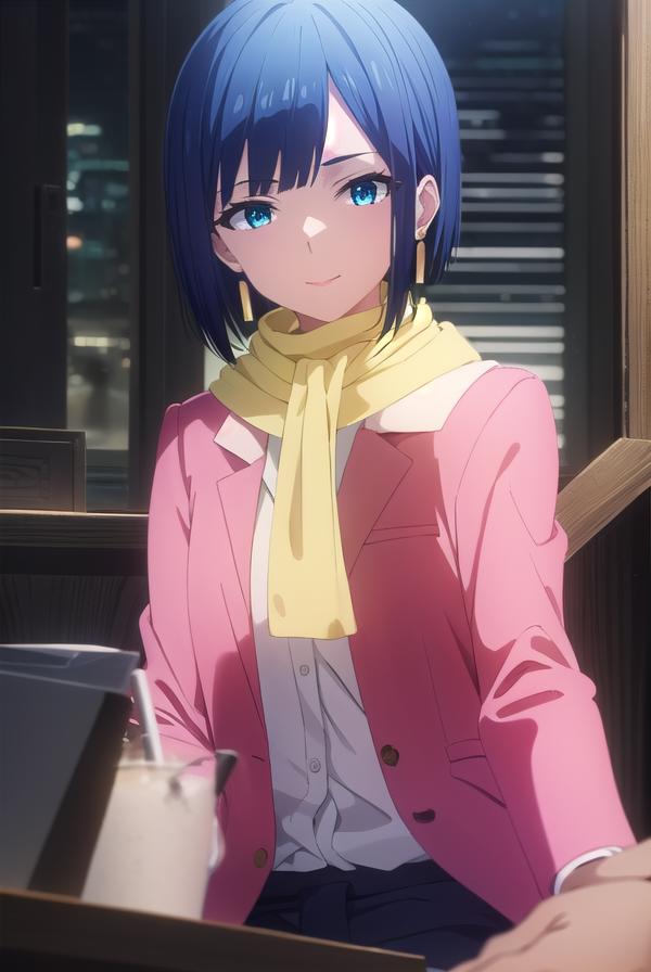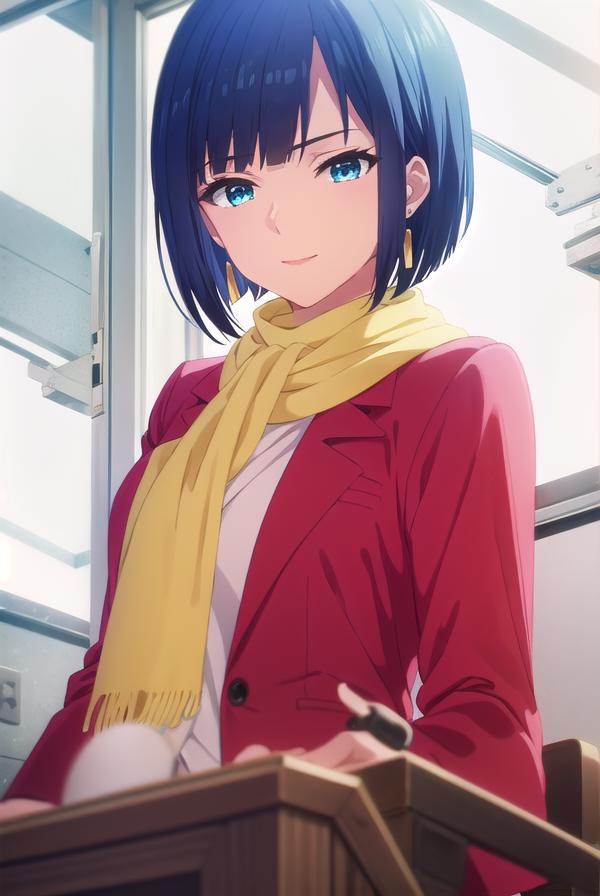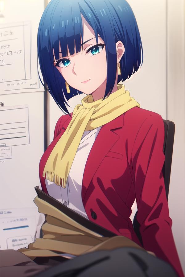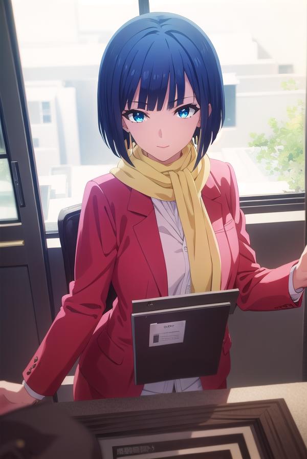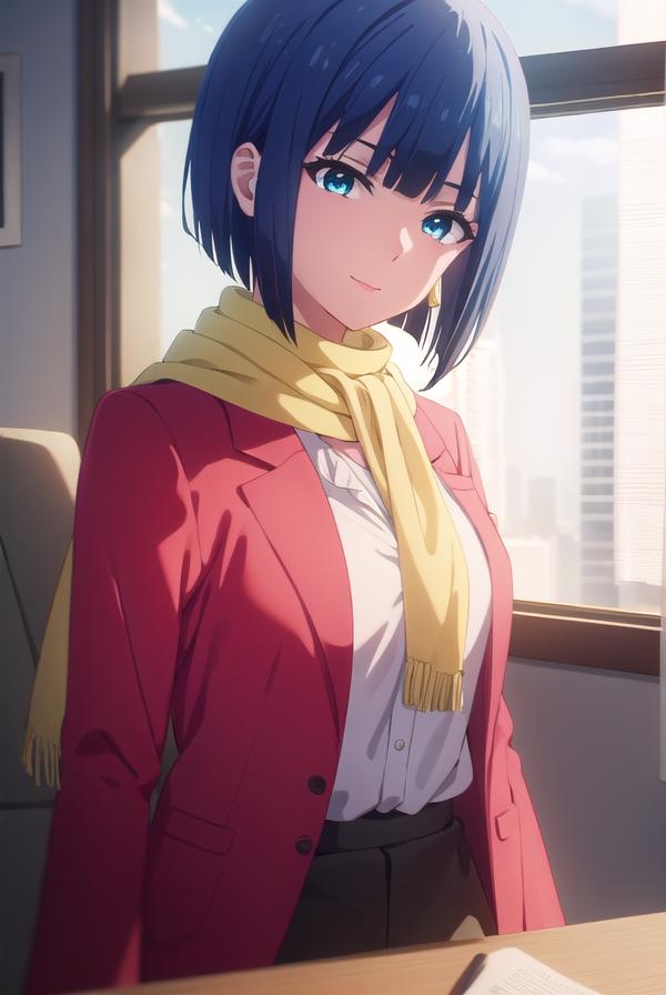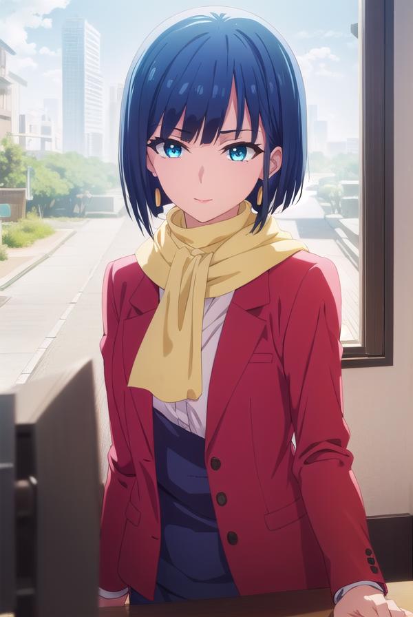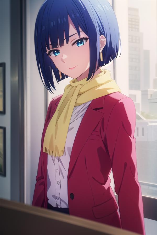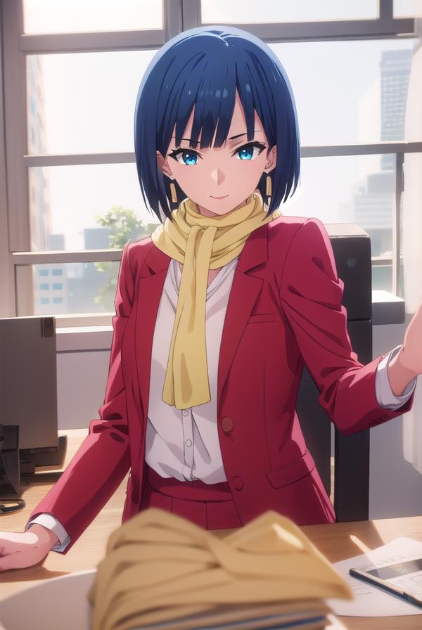 jewelry, jacket, white shirt, earrings, scarf, formal, suit, yellow scarf, (red jacket:1.2),