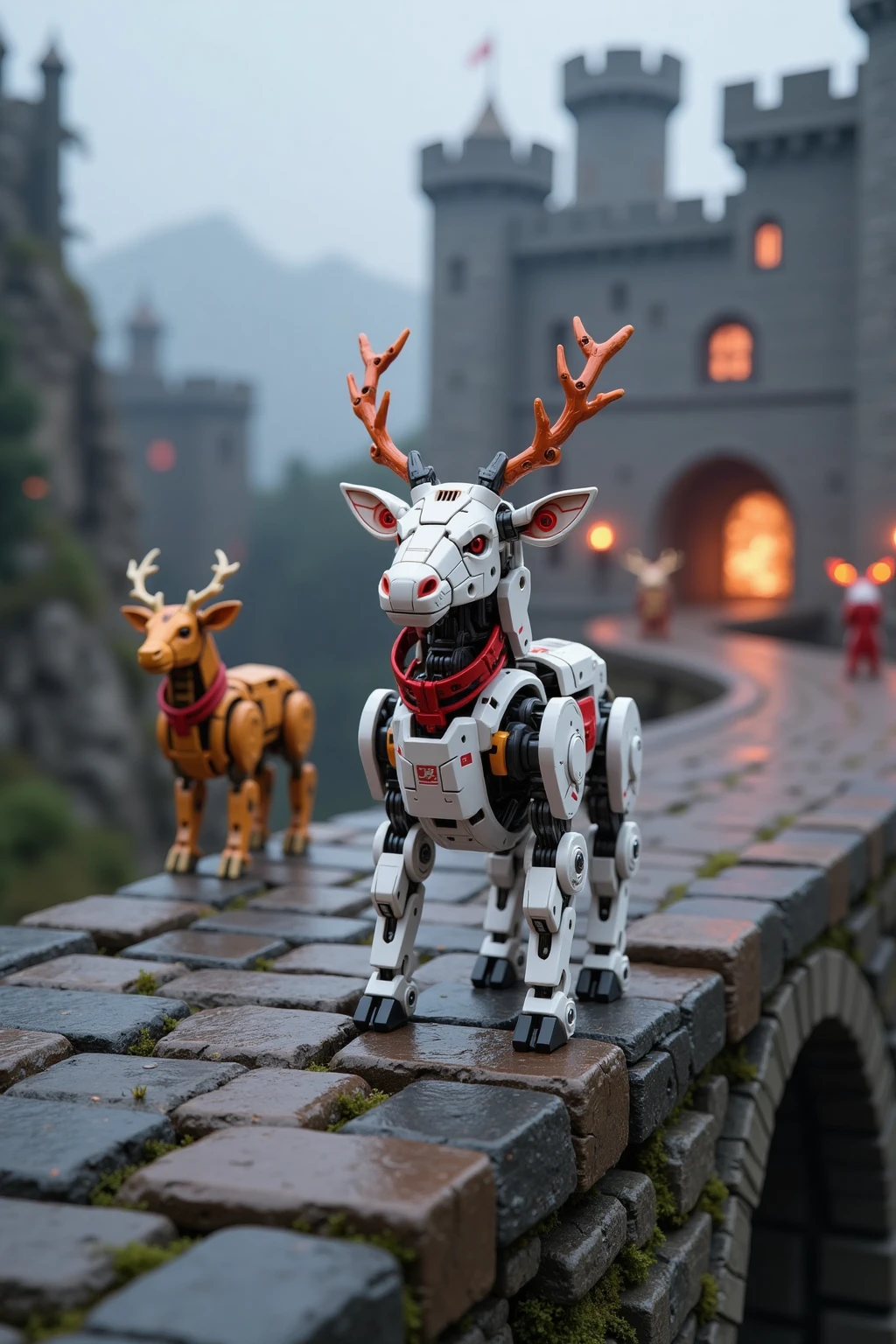 Mechanical zodiac animal models, in a medieval - themed fantasy world, standing on a stone castle bridge, with torches and knights in the background.