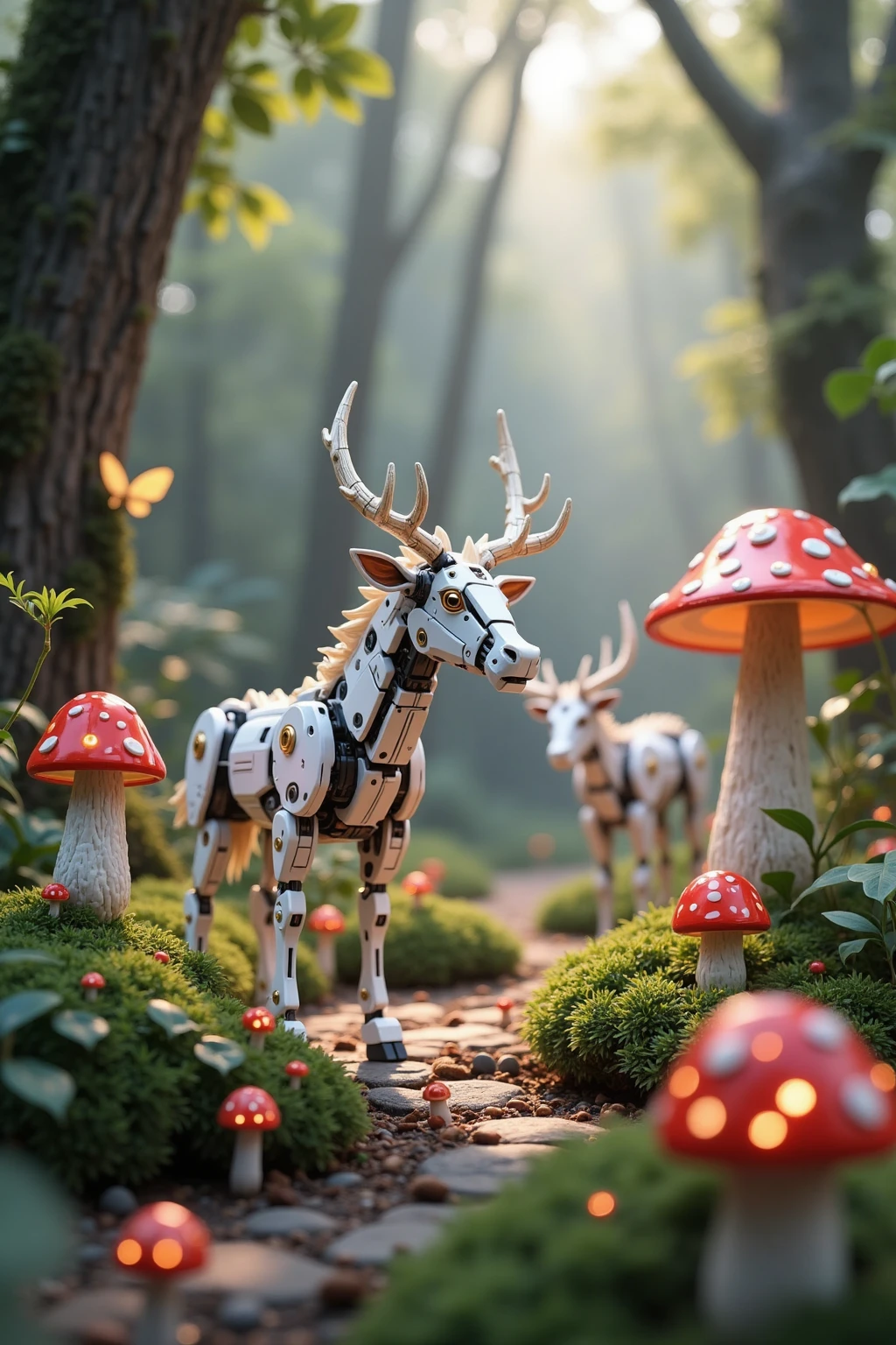 Mechanical zodiac animal models, in a lush, enchanted forest, surrounded by glowing mushrooms and talking fairies, with beams of sunlight filtering through the trees.