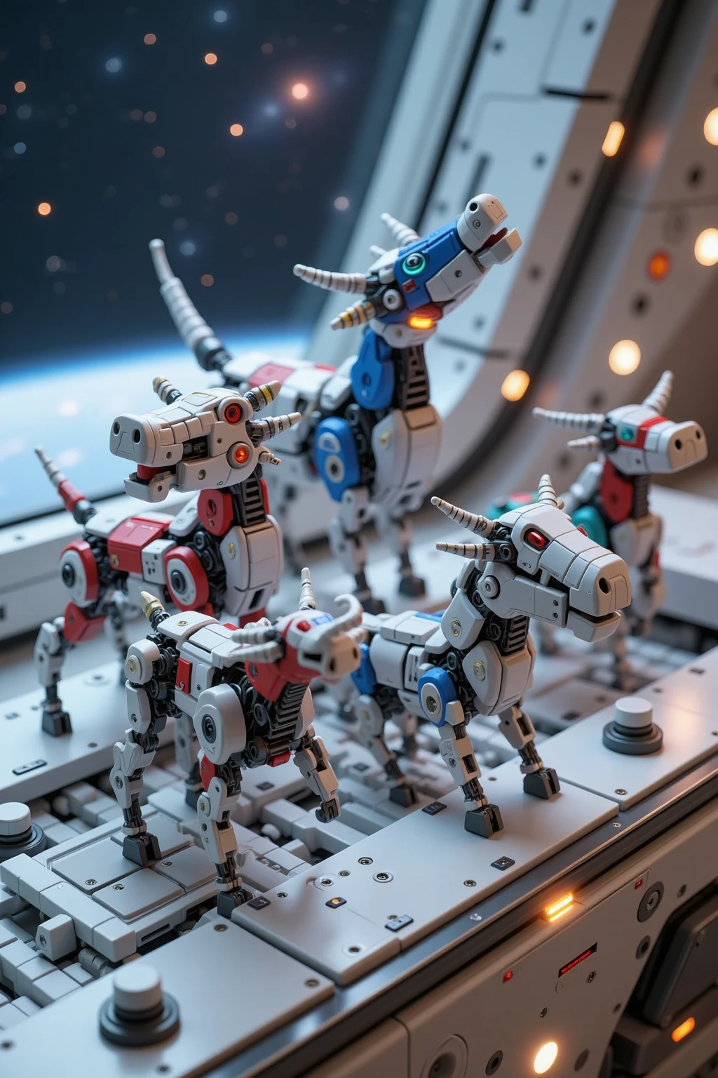 Mechanical zodiac animal models, on a space station, floating weightlessly, with stars and a distant galaxy visible through the windows.