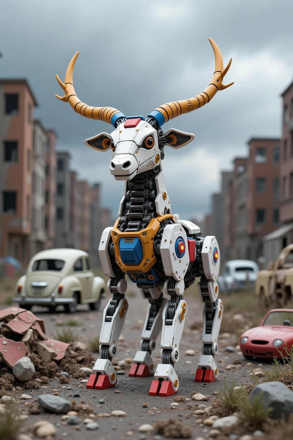 Mechanical zodiac animal models, in a post - apocalyptic wasteland, among rusted cars and crumbling buildings, with a stormy sky above.