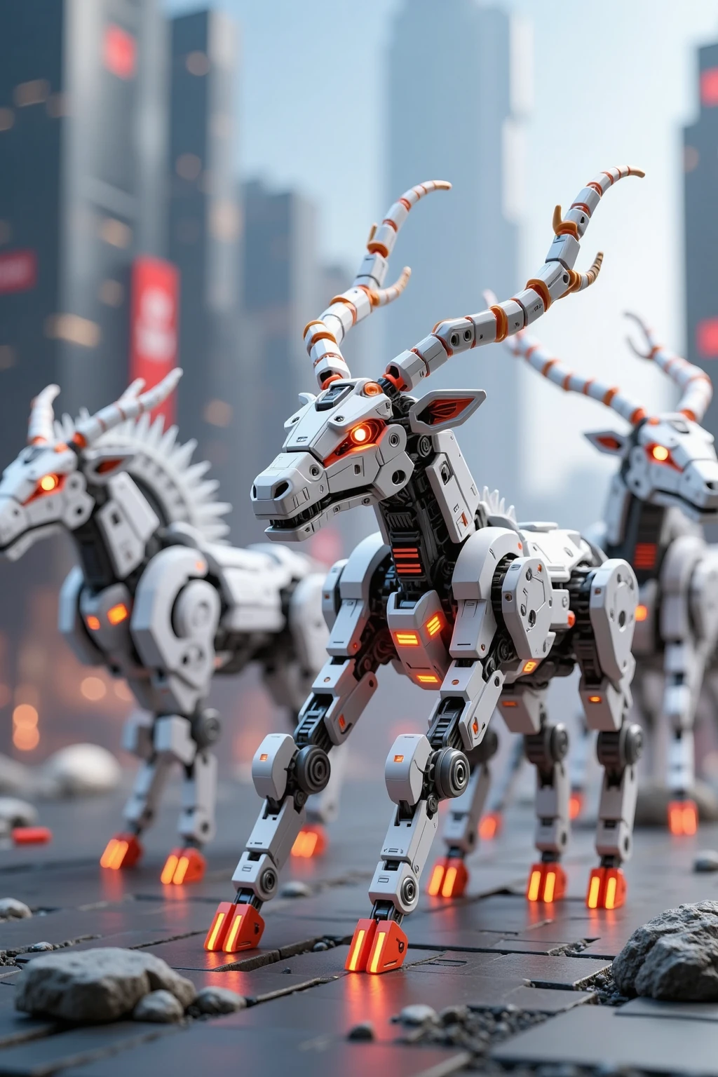 Mechanical zodiac animal models, in a cyberpunk cityscape, glowing neon accents, dynamic action poses, with skyscrapers and flying vehicles in the background.