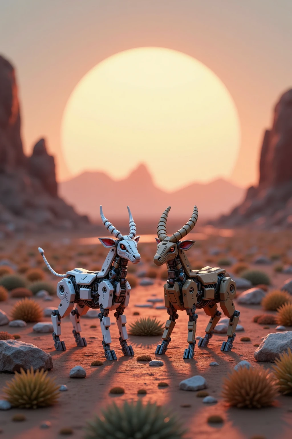 Mechanical zodiac animal models, on a distant alien planet, rocky terrain, with strange plants and a dual - sun sunset casting long shadows.