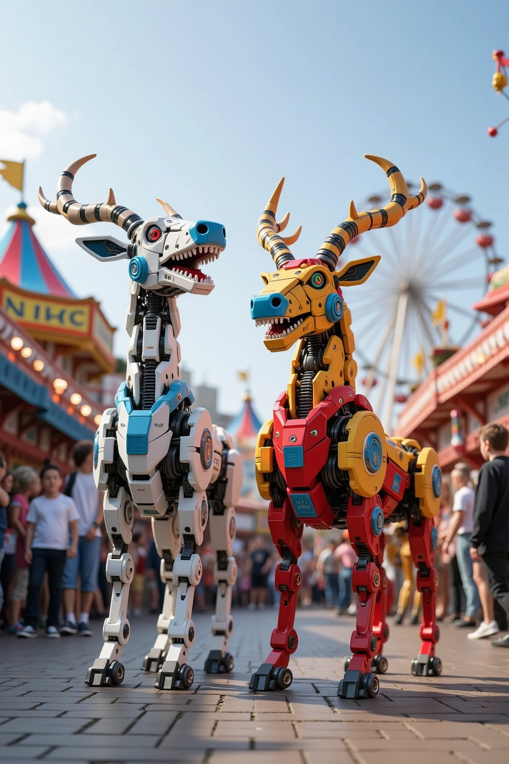 Mechanical zodiac animal models, in a carnival setting, with colorful tents, ferris wheels, and excited onlookers around them.