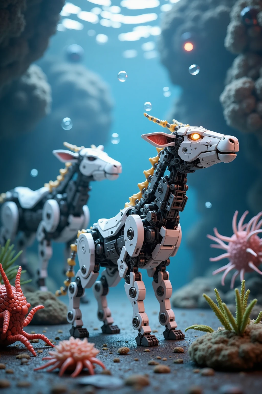 Mechanical zodiac animal models, underwater in an advanced aquatic base, surrounded by bioluminescent sea creatures, with high - tech bubbles and metal structures.