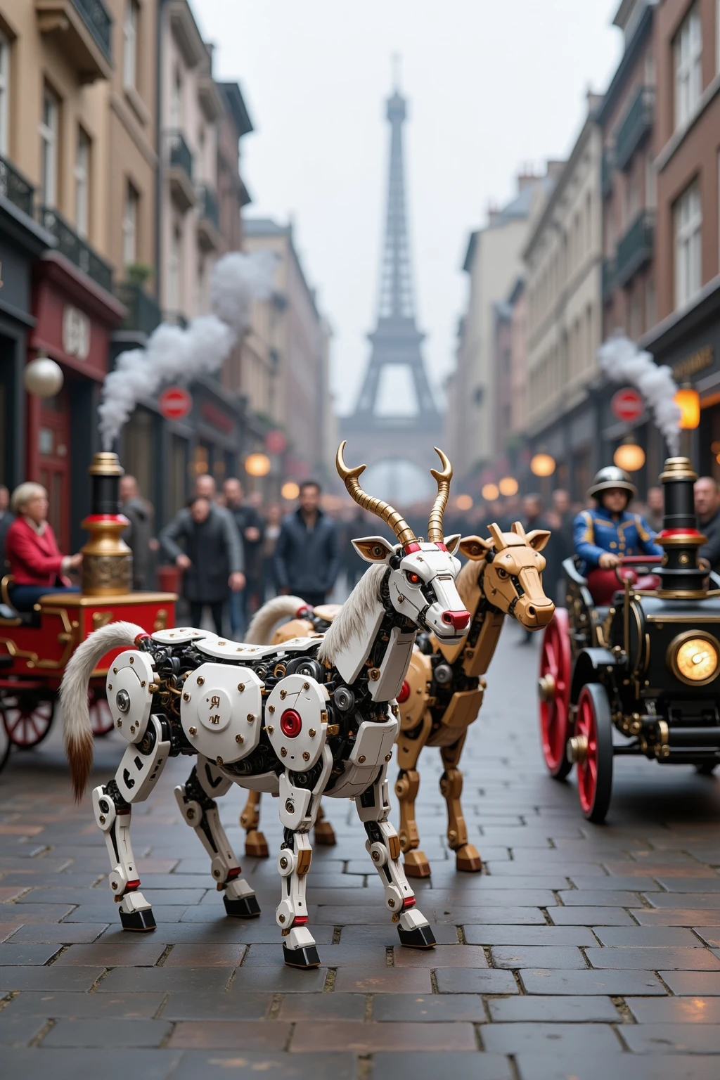 Mechanical zodiac animal models, in a steampunk London street, surrounded by steam - powered carriages, clockwork gadgets, and smokestacks.
