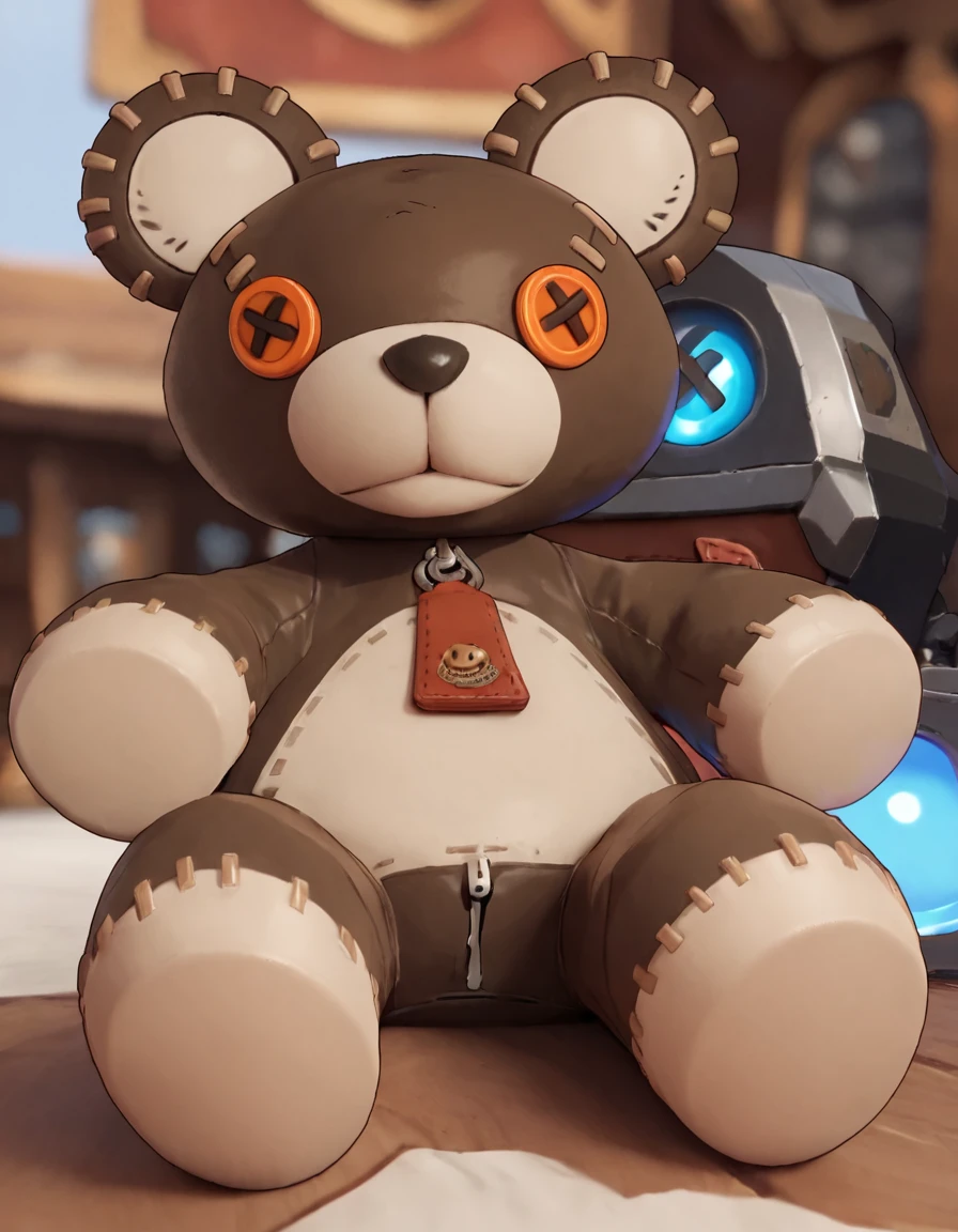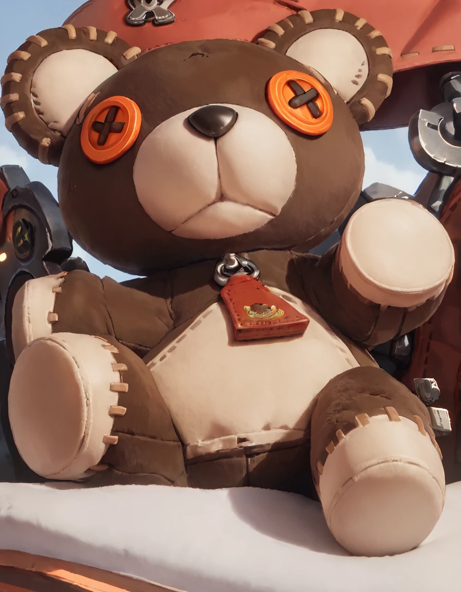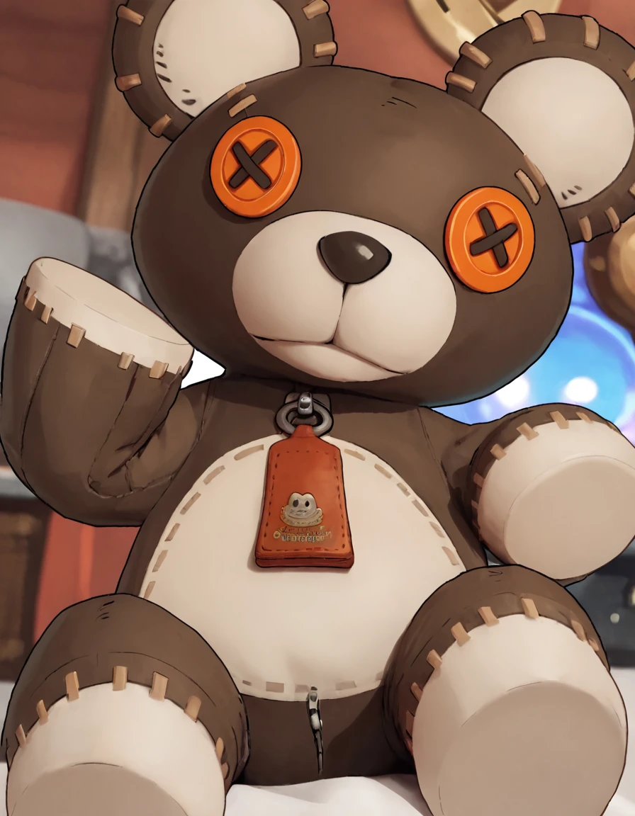 r0gerggs, stuffed toy, teddy bear, looking at viewer, zipper pull tab, stitches, roger (guilty gear)