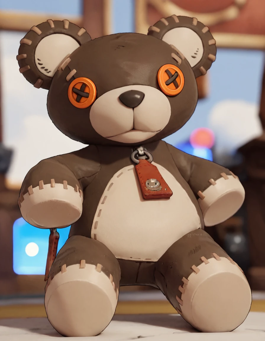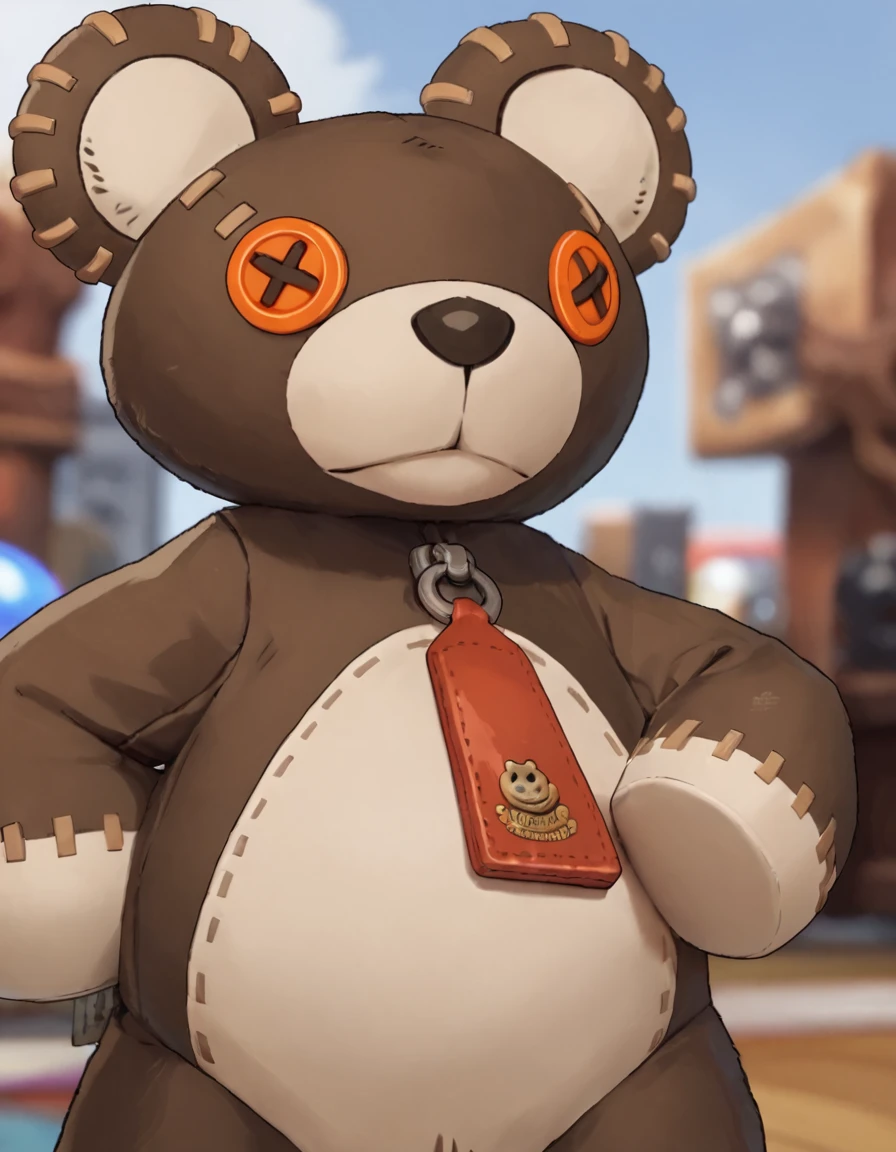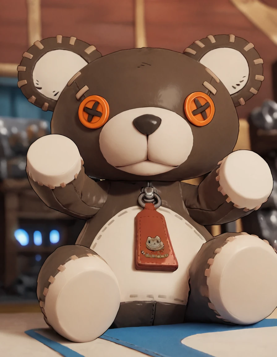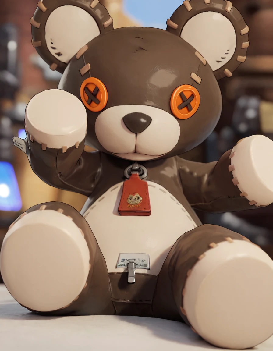 r0gerggs, stuffed toy, teddy bear, looking at viewer, zipper pull tab, stitches, roger (guilty gear)