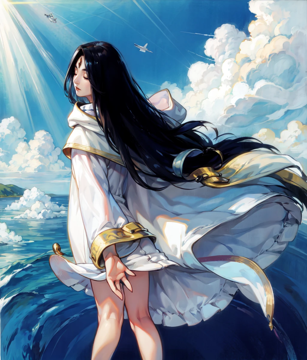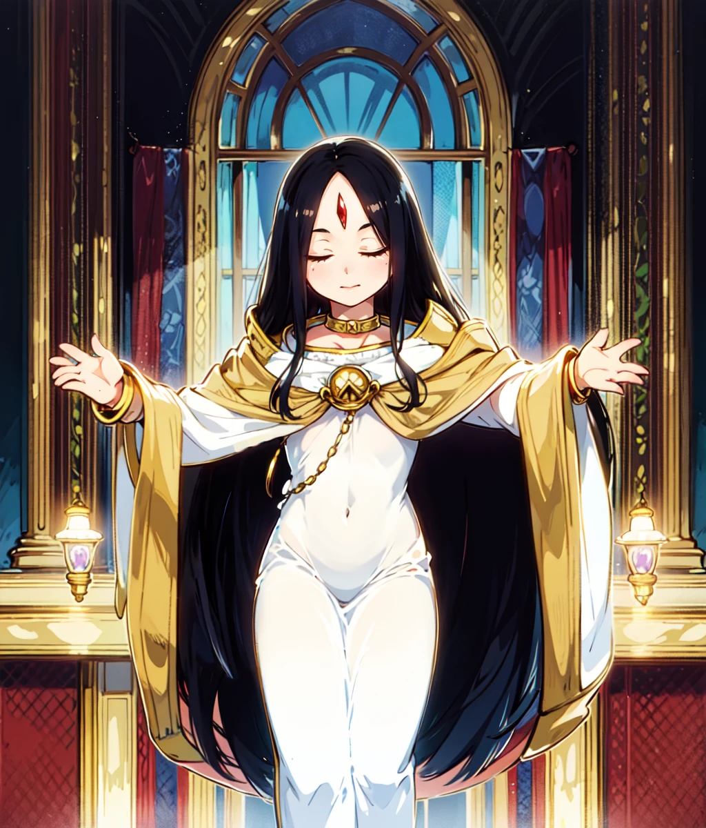 Notable tags: long hair, black hair, eyes closed, forehead jewel, white tunic,
