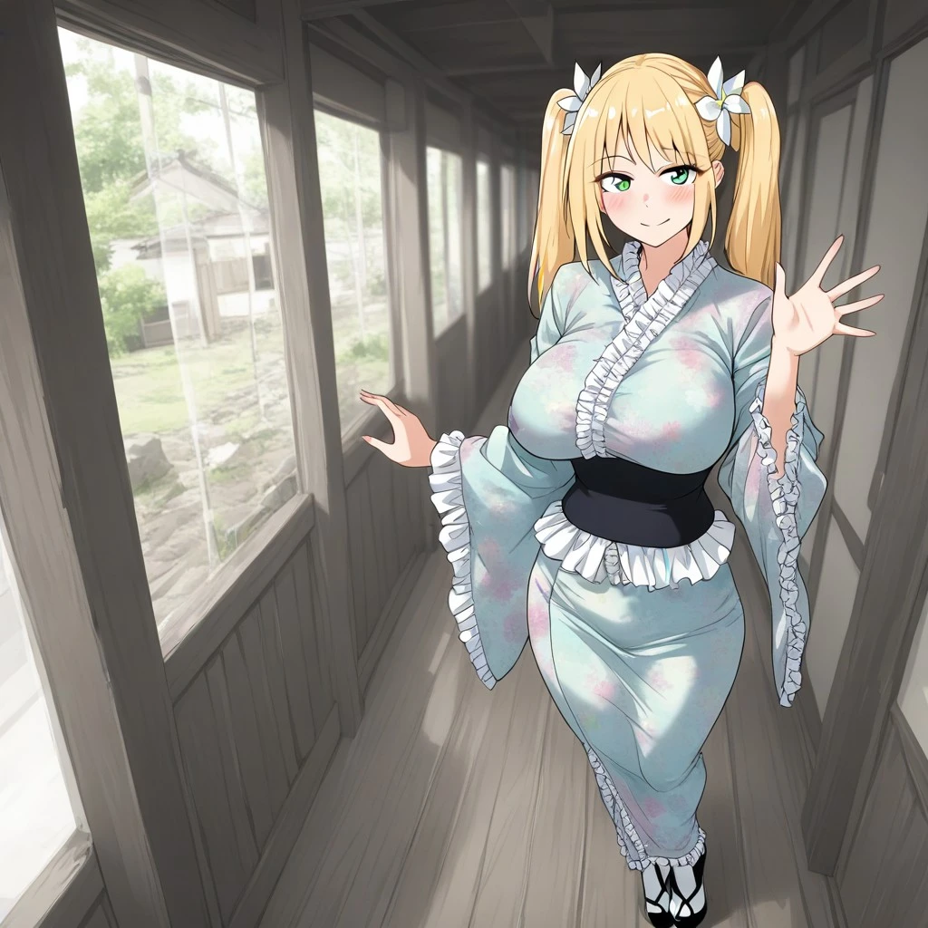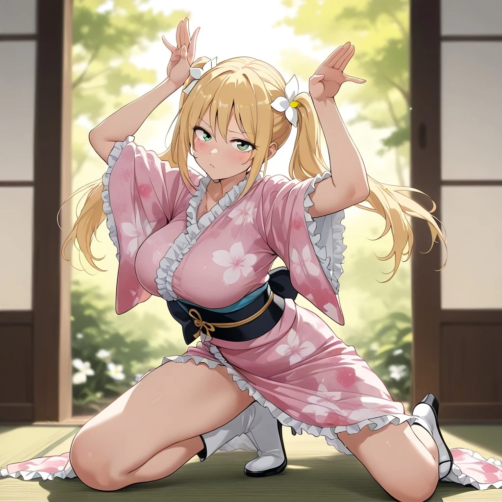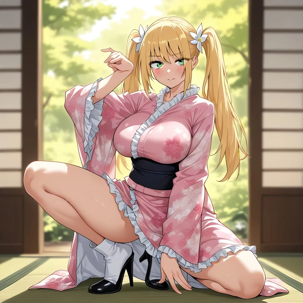 Erina, 1girl, solo, green eyes, large breasts, blonde hair, twintails, hair between eyes, white flower head bands, pink kimino, flower printed kimono, white frills, frilled kimono, black obi, highheel shoes, ninja footwear