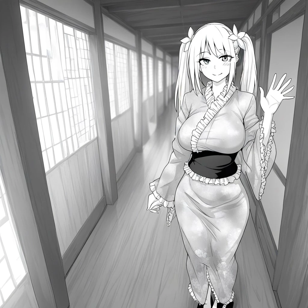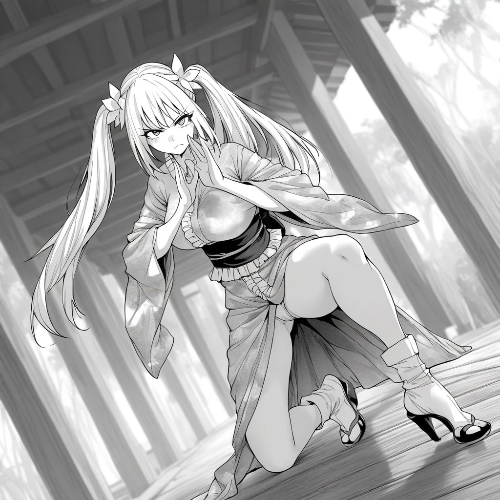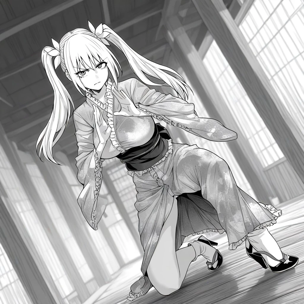 Erina, 1girl, solo, green eyes, large breasts, blonde hair, twintails, hair between eyes, white flower head bands, pink kimino, flower printed kimono, white frills, frilled kimono, black obi, highheel shoes, ninja footwear