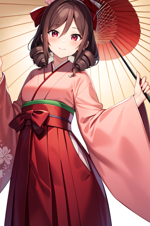 Default Outfit: harukazekc,twin drills,red bow,japanese clothes,pink kimono,wide sleeves,red hakama skirt,