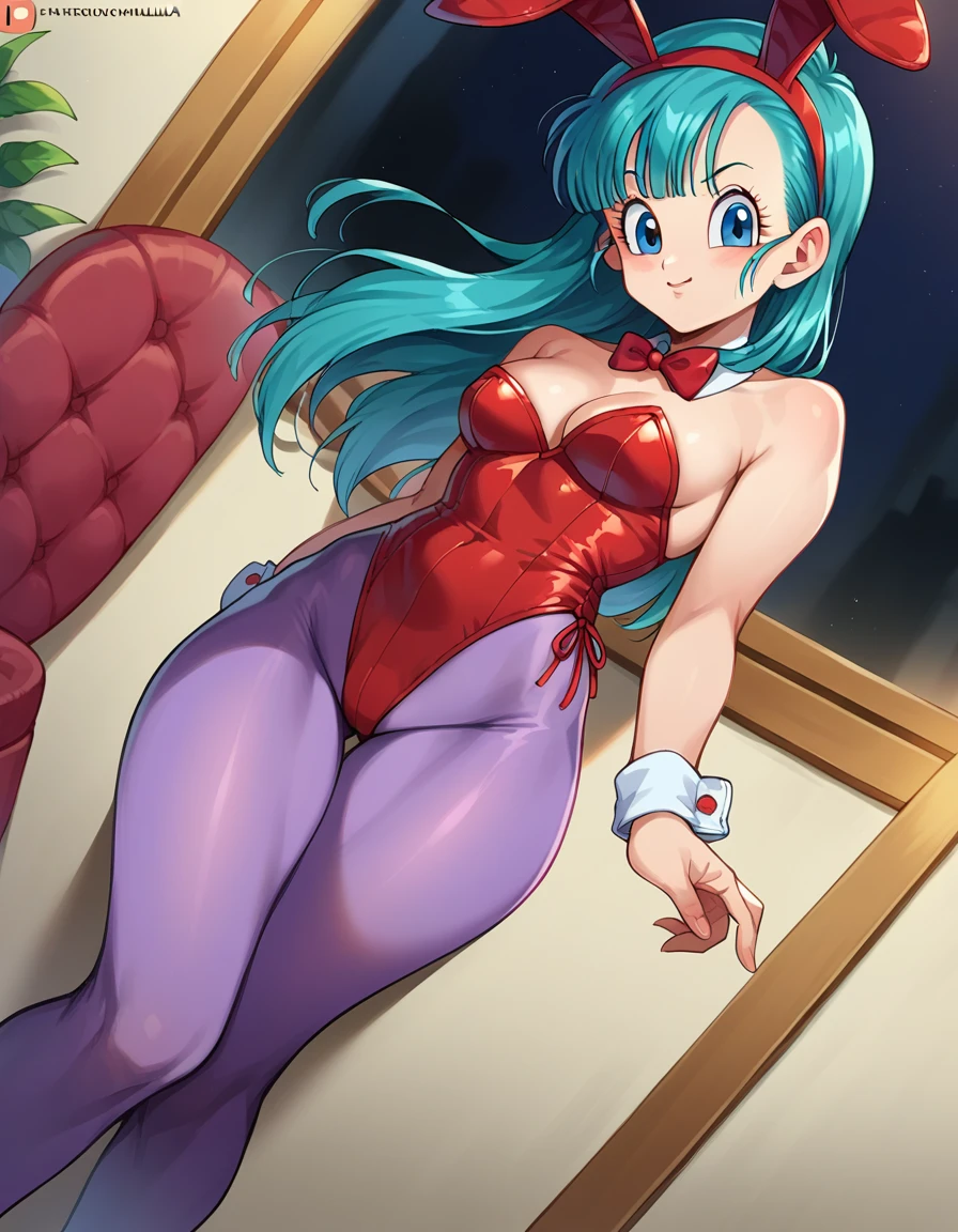 long hair, animal ears, bare shoulders, black leotard, bow, bowtie, cleavage, detached collar, fake animal ears, high heels, leotard, pantyhose, playboy bunny, purple pantyhose, rabbit ears, red bow, red bowtie, red footwear, straight hair, strapless, strapless leotard, wrist cuffs