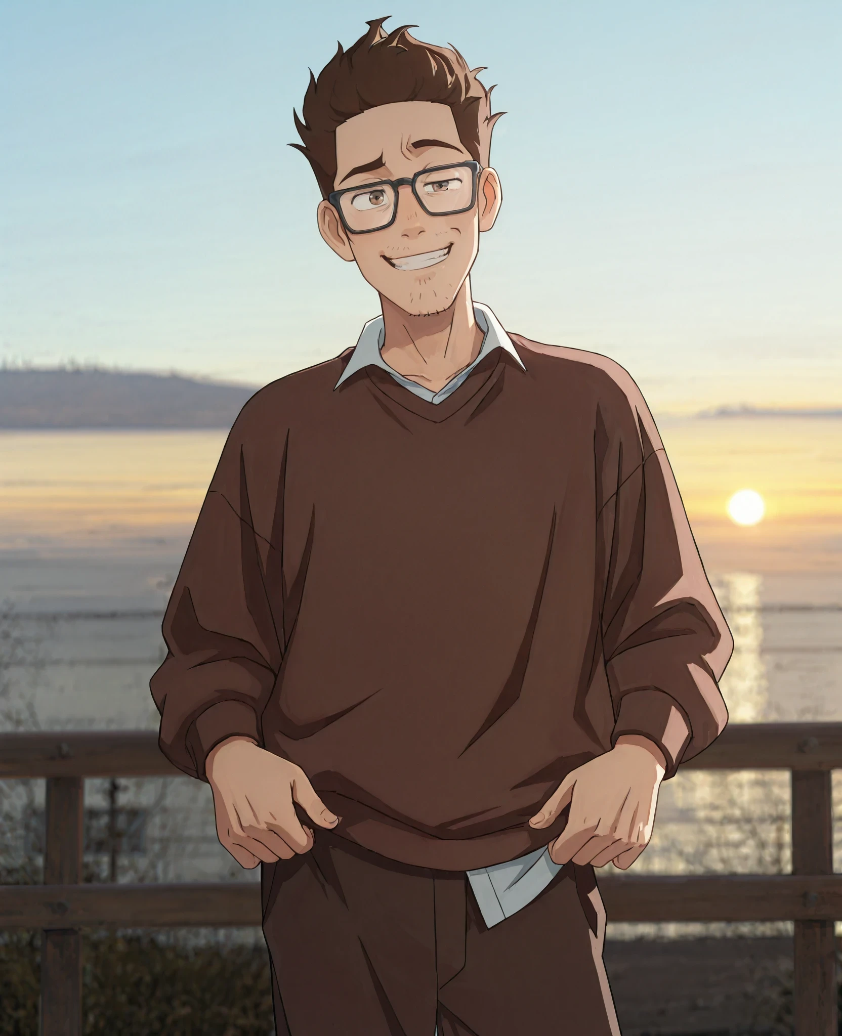 Base Prompt: D4v1dK1m, 1boy, male focus, glasses, short hair, brown hair, brown eyes, facial hair, stubble