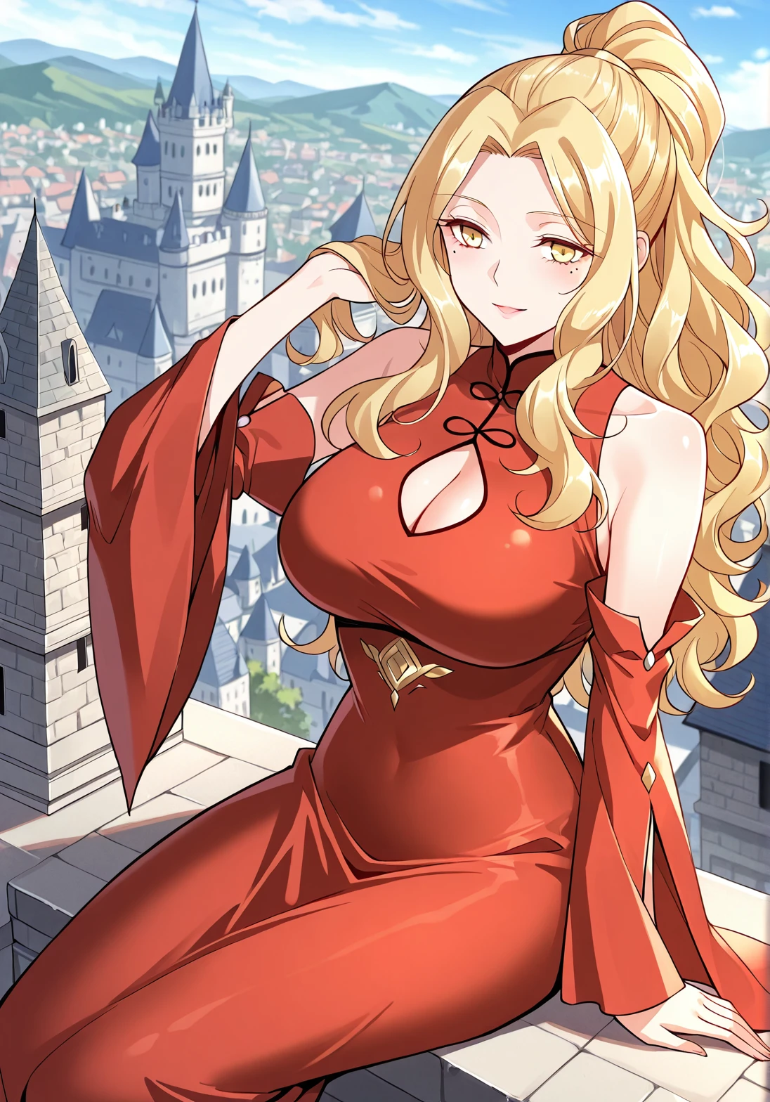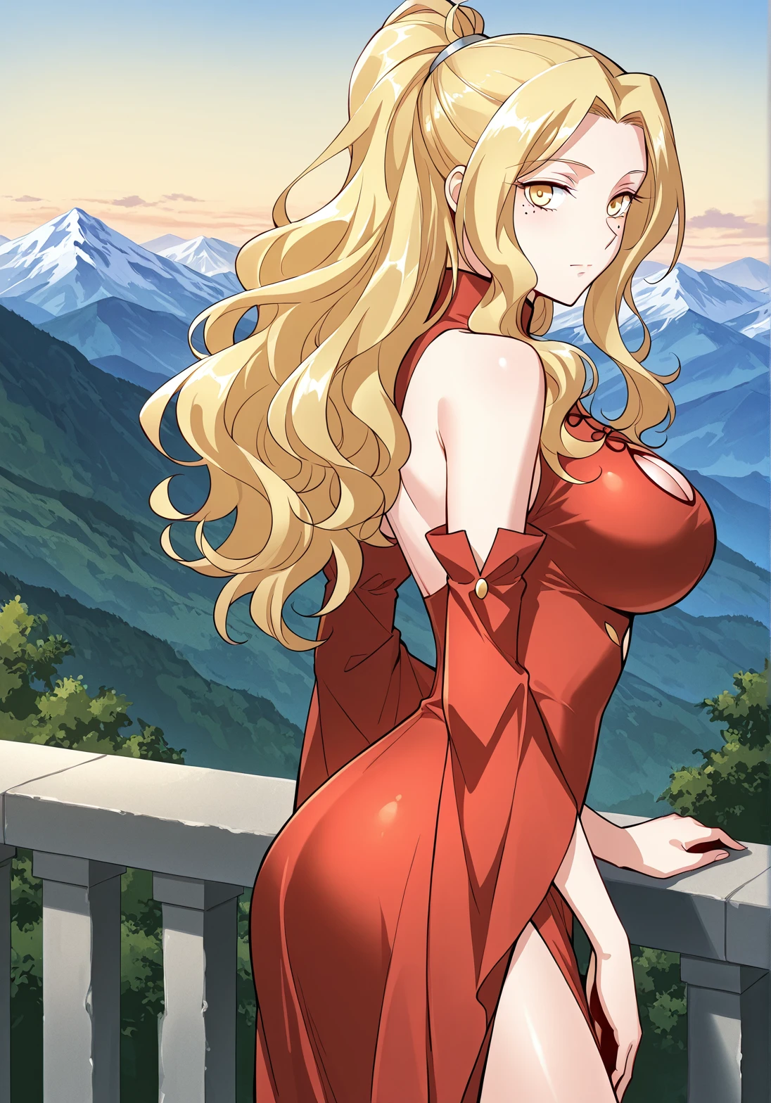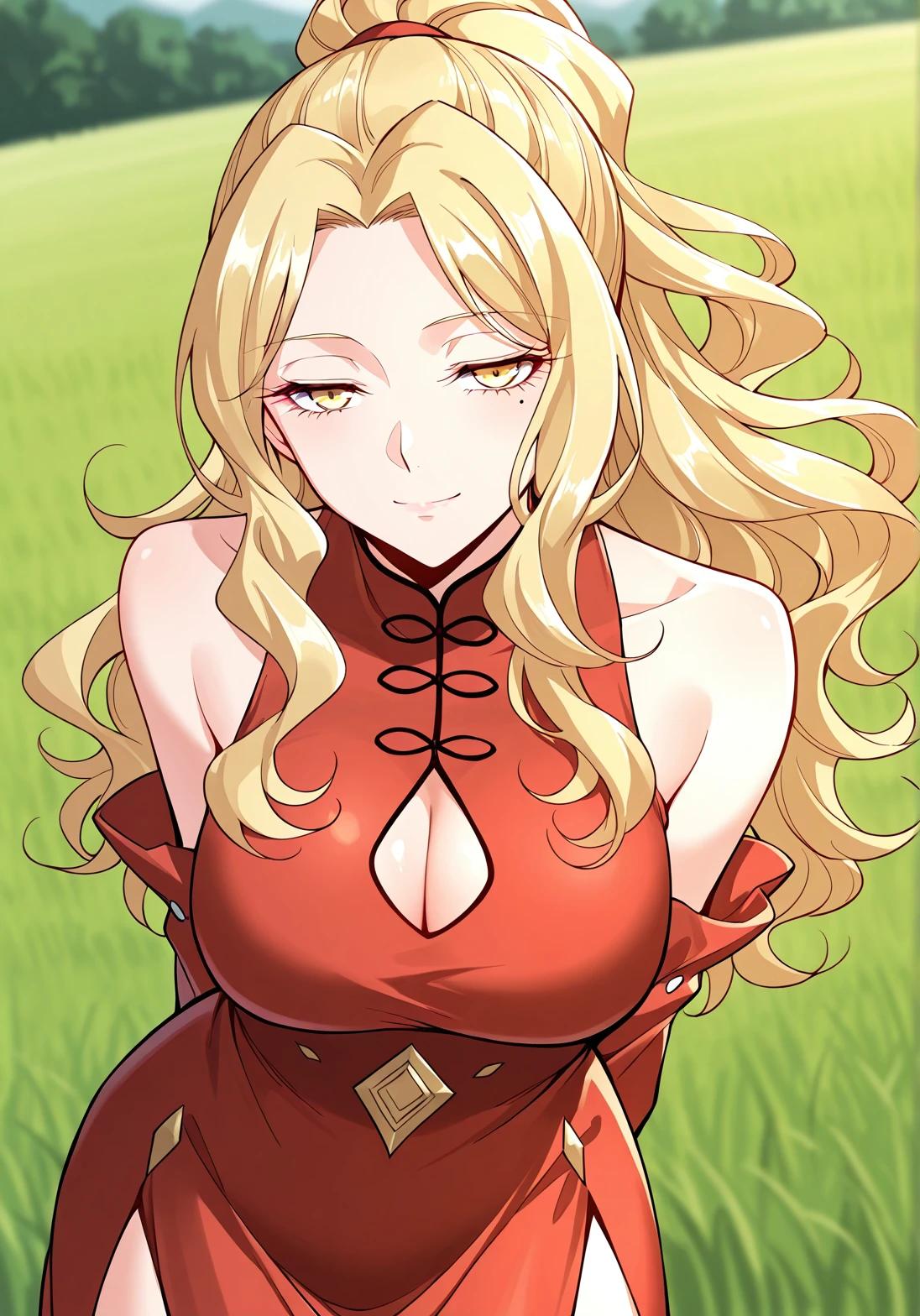 1 girl, solo, yellow eyes, blonde hair, wavy hair, long hair, ponytail, cleavage, cleavage cutout, mole under eye, large breasts