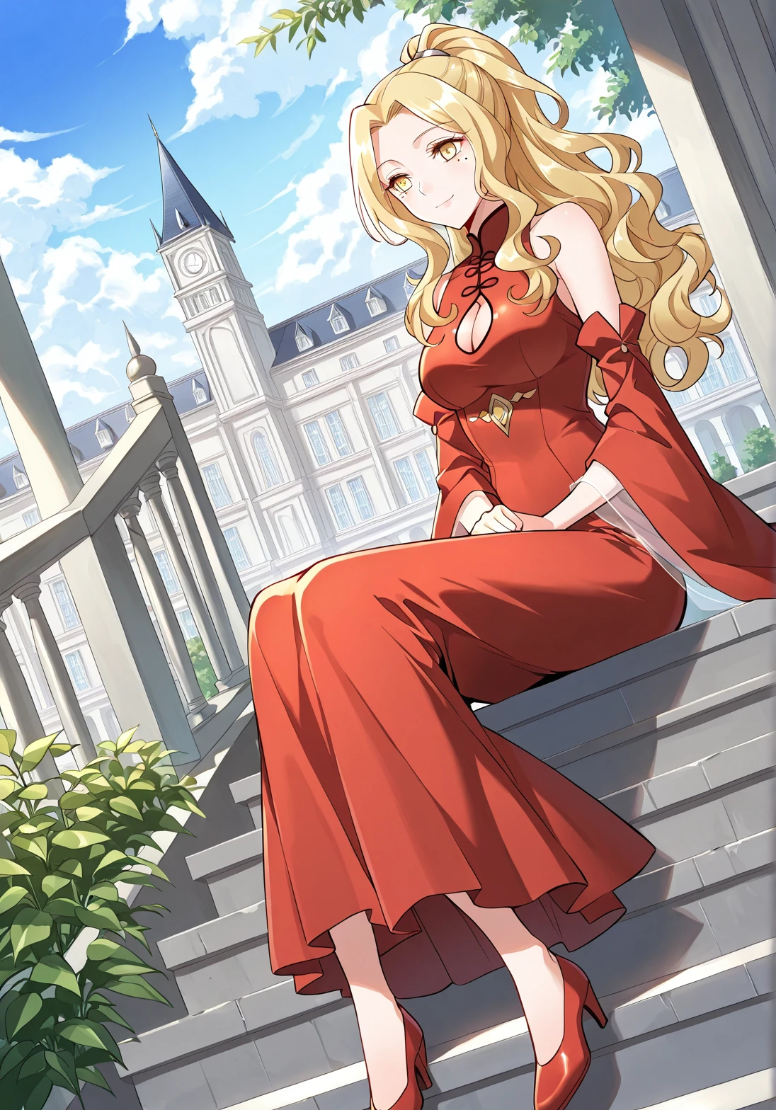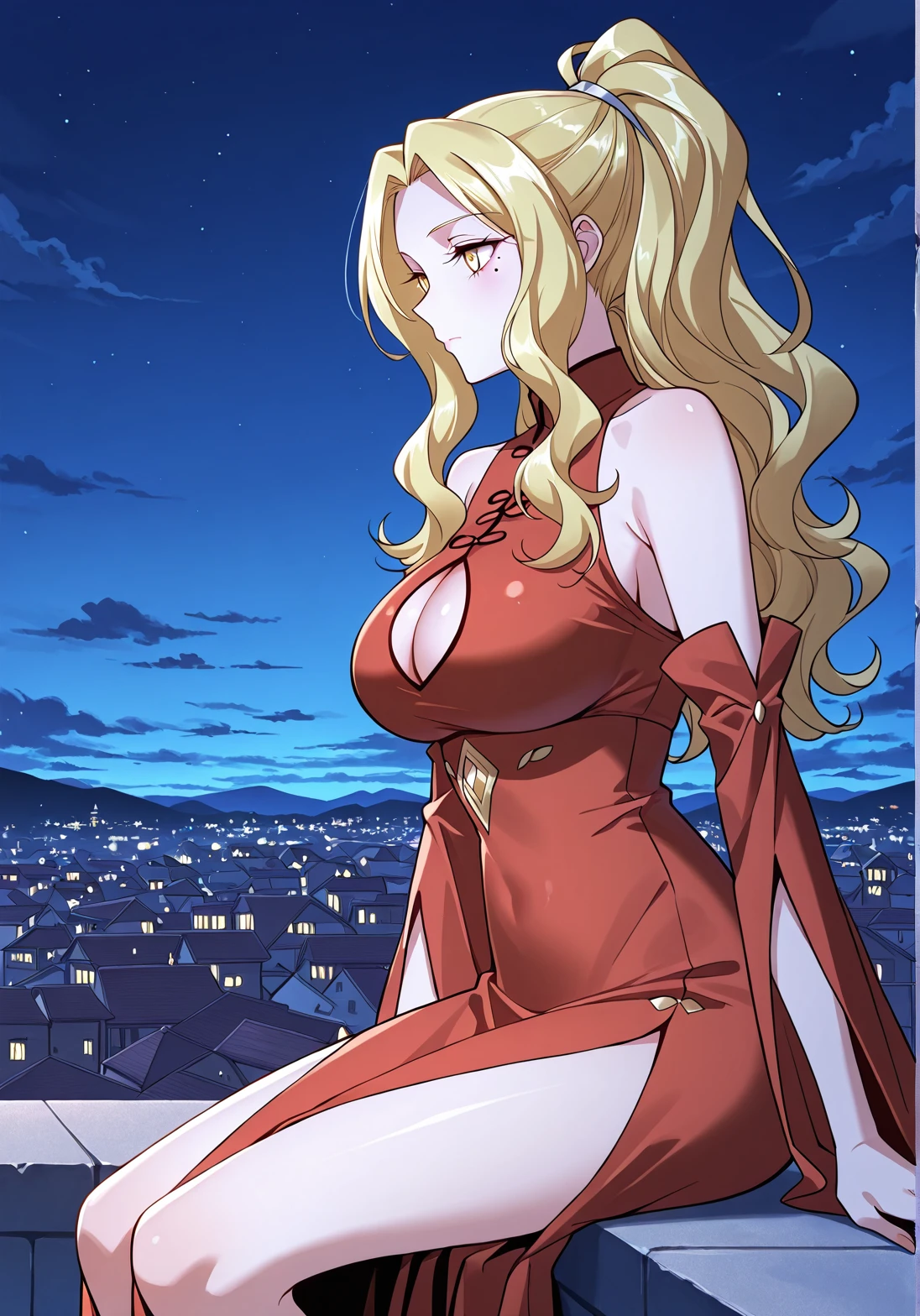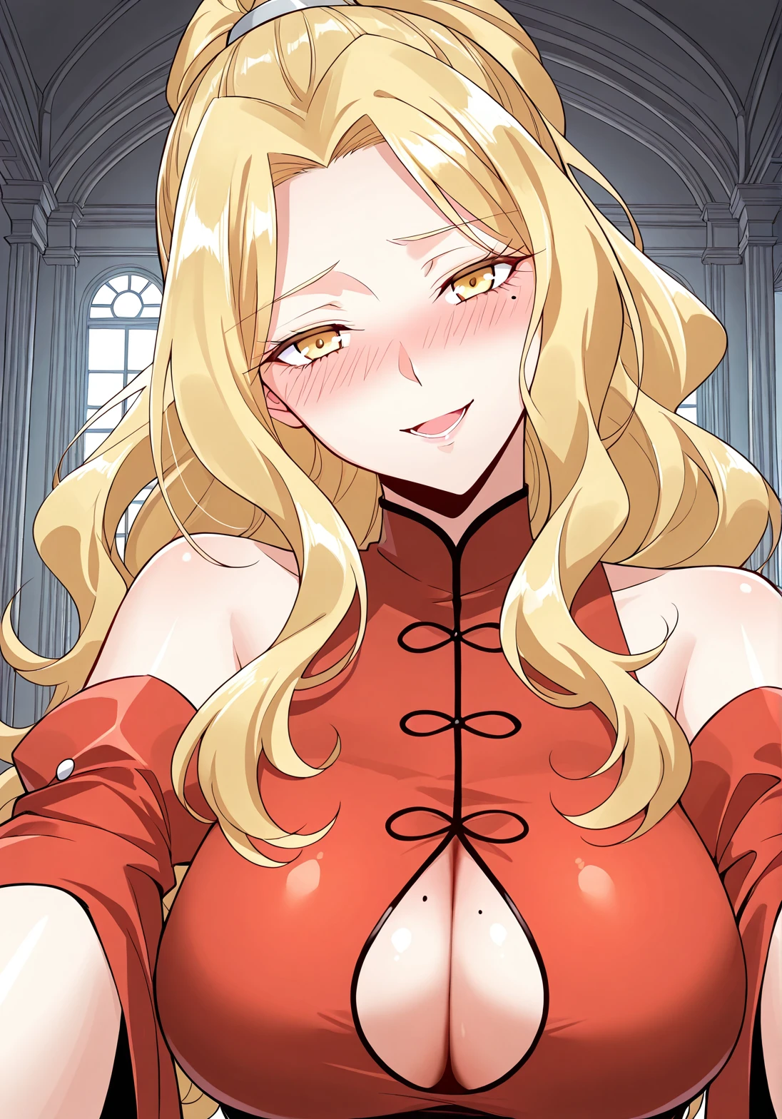 1 girl, solo, yellow eyes, blonde hair, wavy hair, long hair, ponytail, cleavage, cleavage cutout, mole under eye, large breasts