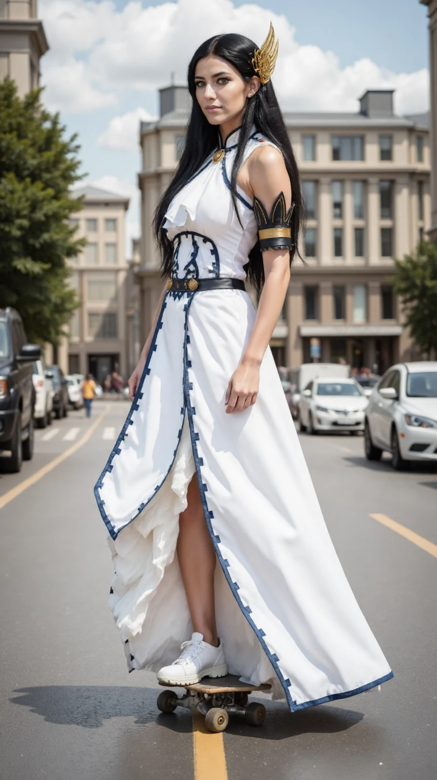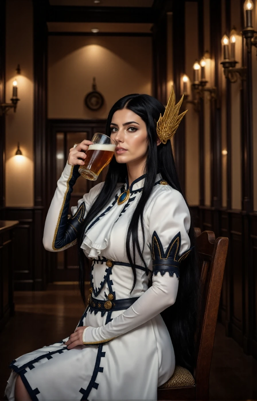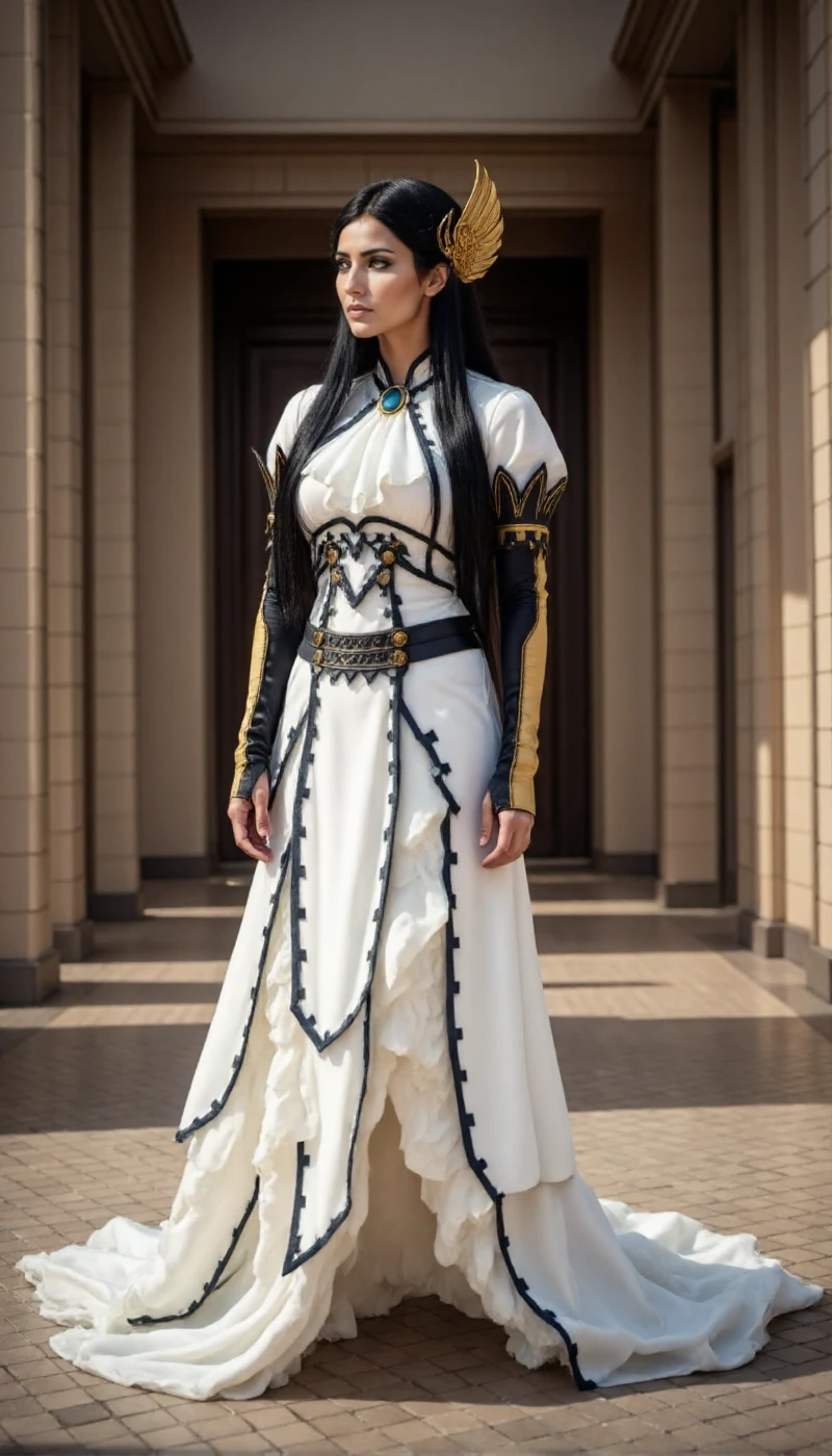 Brunehilde is a woman with blackhair and hair ornemement and white dress