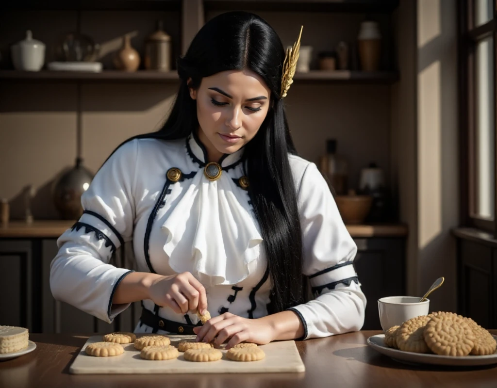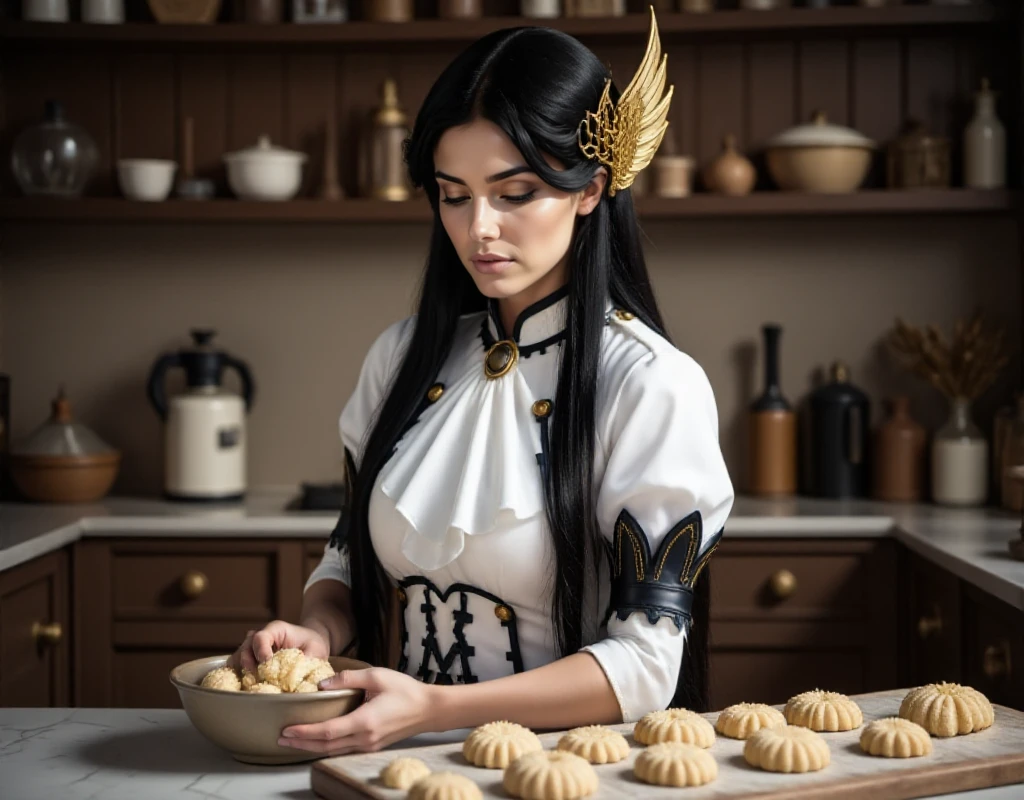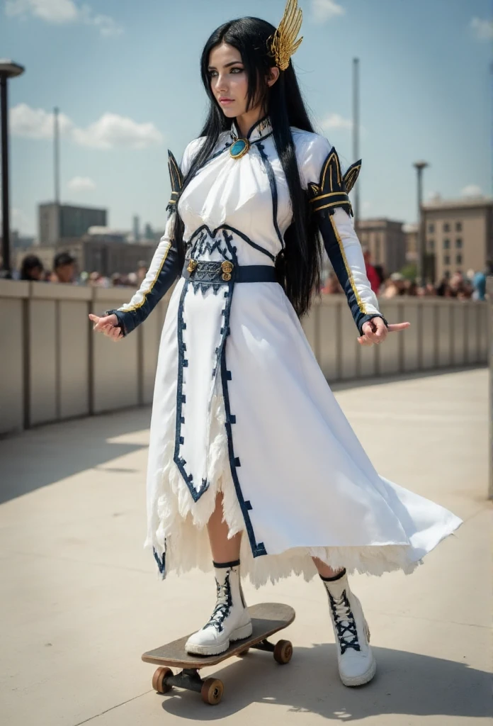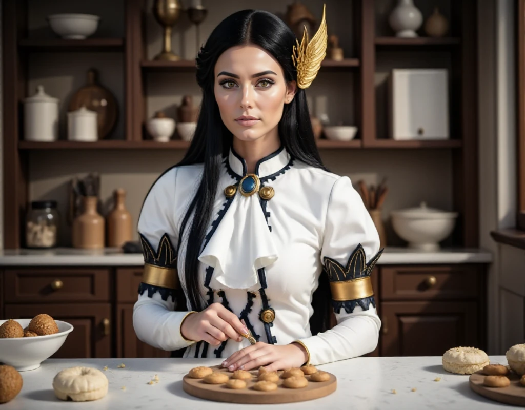 Brunehilde is a woman with blackhair and hair ornemement and white dress