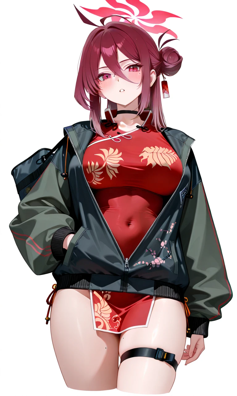 Kayama Reijo from Blue Archive shines with clear skin, very long ombrΓ© hair, red eyes, hair between the eyes, a high ponytail with loose strands, an antenna-like strand, a mole under the eye, and a pink halo. She accessorizes with a black choker and a thigh strap. Her outfit includes a short red qipao, an open dark letterman jacket, gray jacket with red-lined long sleeves, green jacket sleeves, a pelvic curtain, black knee-high stockings, and red/white sneakers with black details.