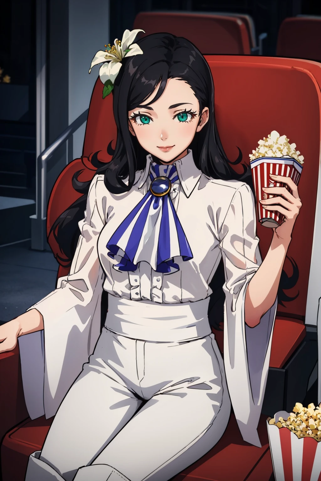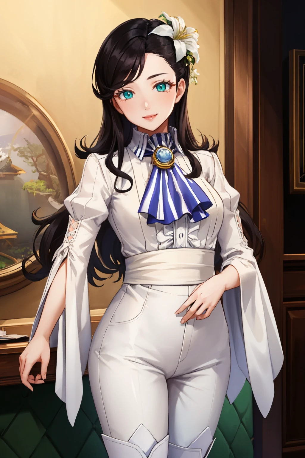 nagipq2, very long hair, black hair, green eyes, hair flower, shirt, ascot, long sleeves, puffy sleeves, pants, knee boots, mature female