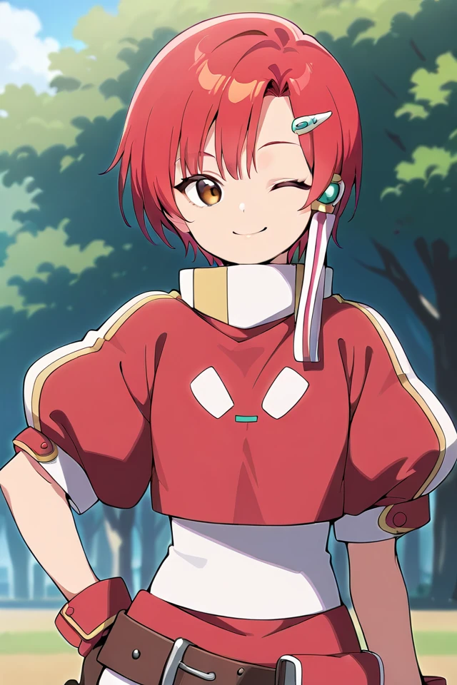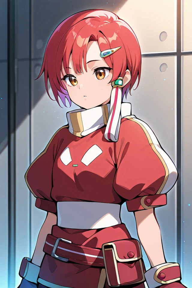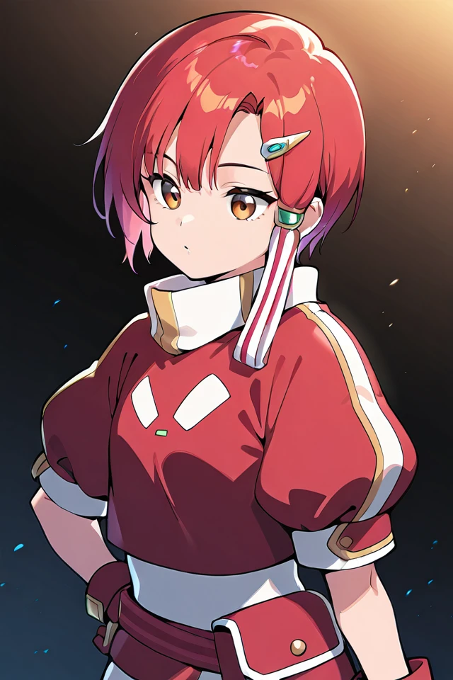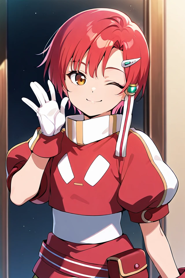 kachua rees, red hair, short hair, gloves, brown eyes, short sleeves, puffy sleeves,