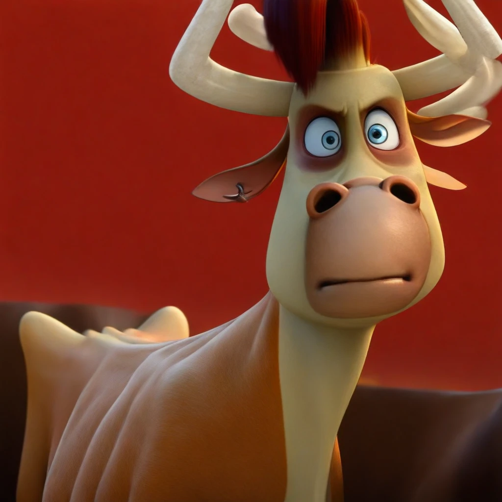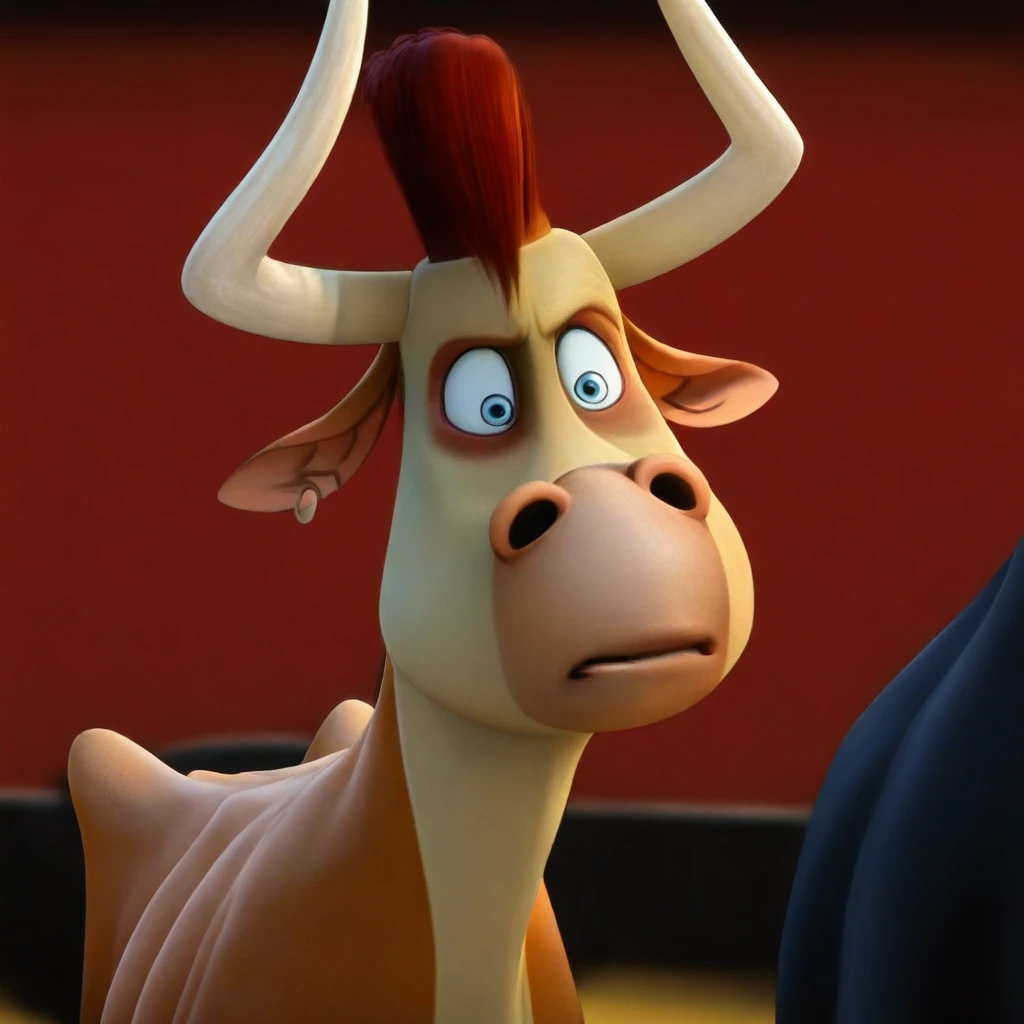 Bones, bull, orangish-brown fur, Yellowish-beige underbelly, light blue Eyes, pinkish beige snout, clipped ears, long white horns, Red hair tuft,