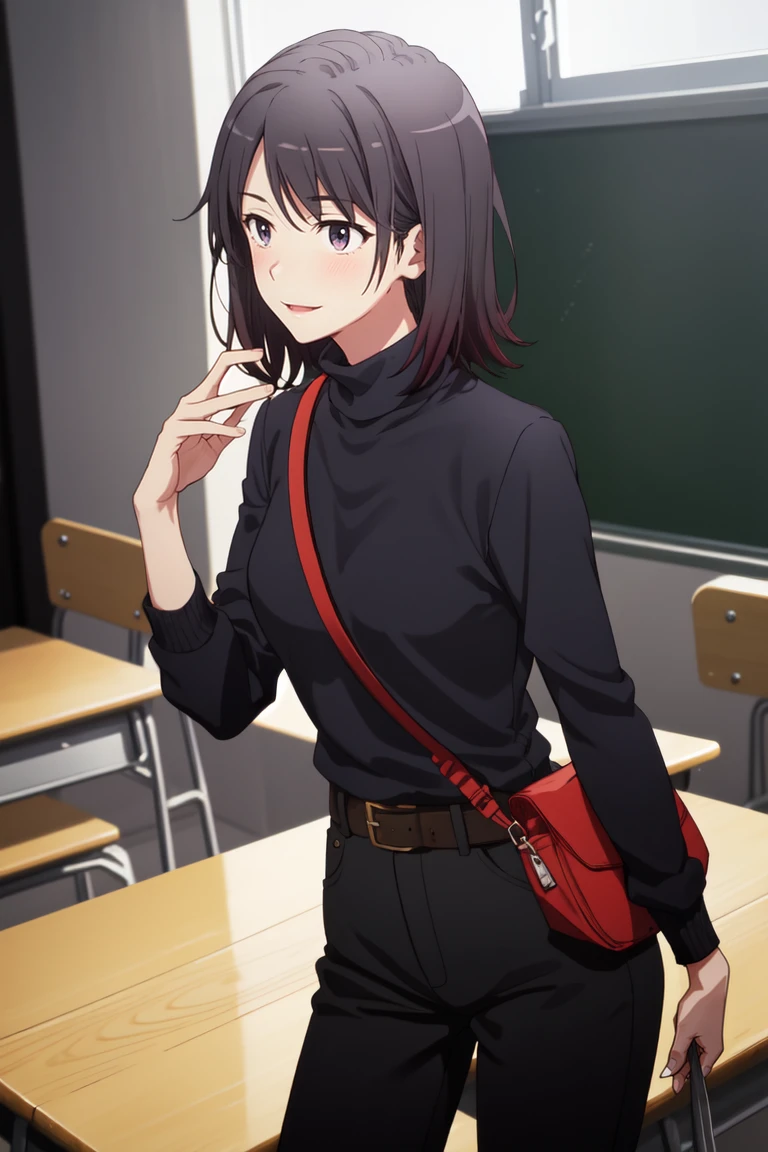 turtleneck sweater, long sleeves, black pants, (sling bag:1.2)