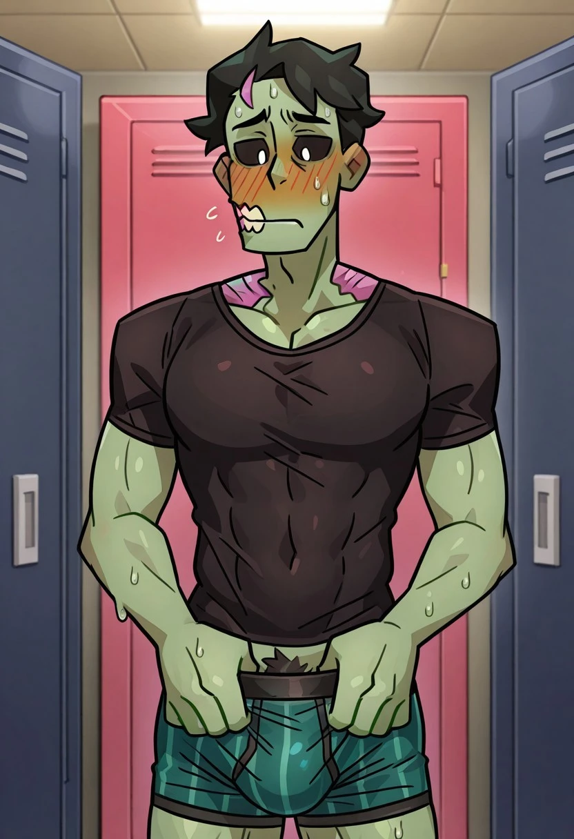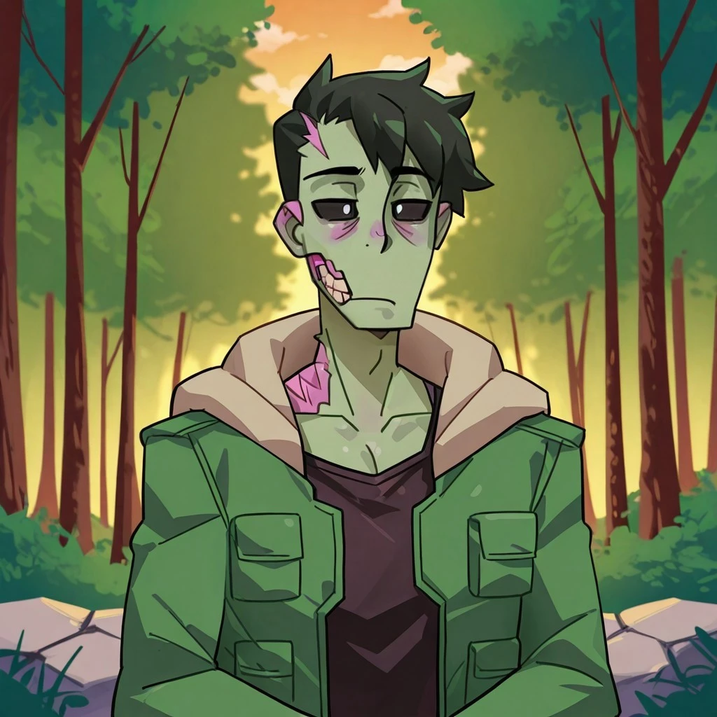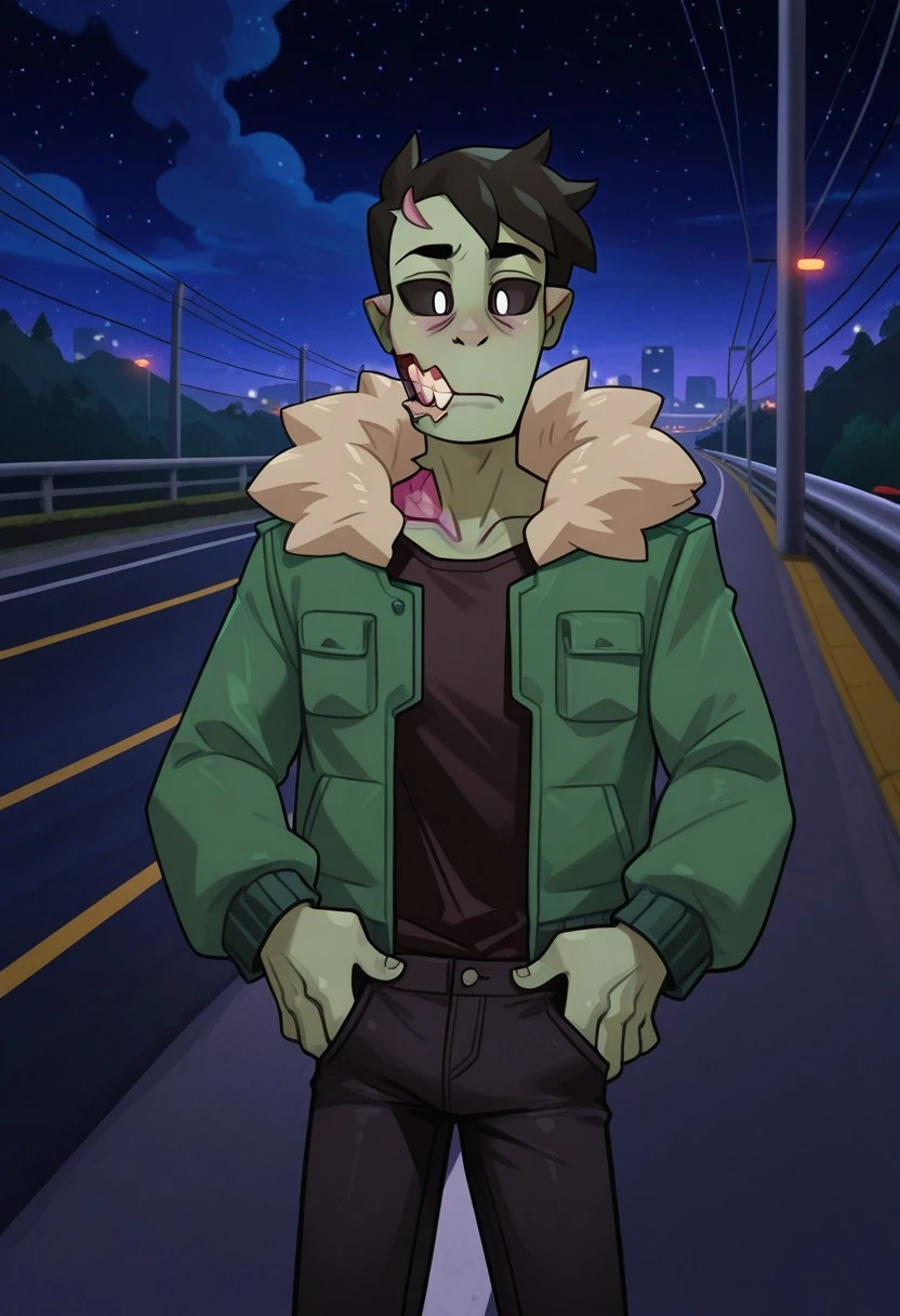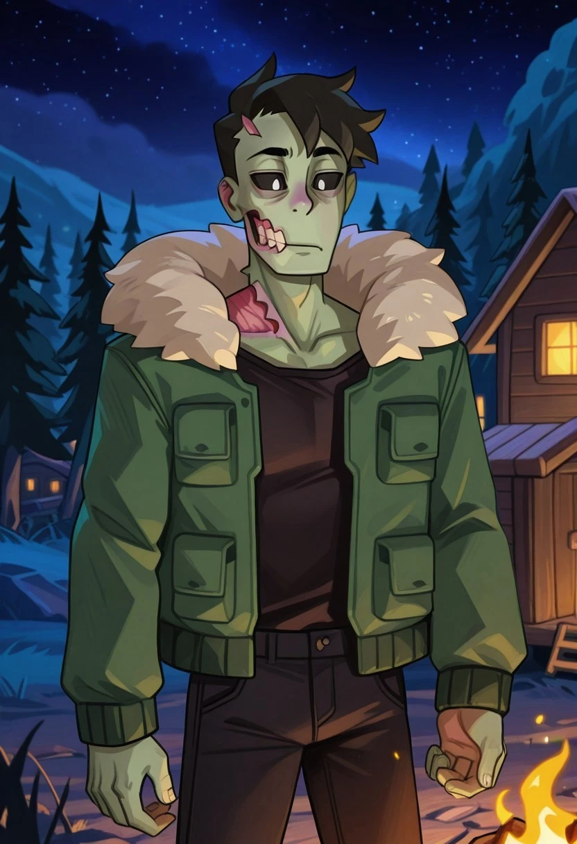 Zombie, Male, green skin, black sclera, white pupils, black shirt, green jacket, fur trim, black pants, brown boots,