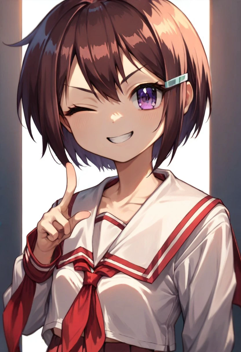 short hair, brown hair, small chest (violet eyes: 1.2)