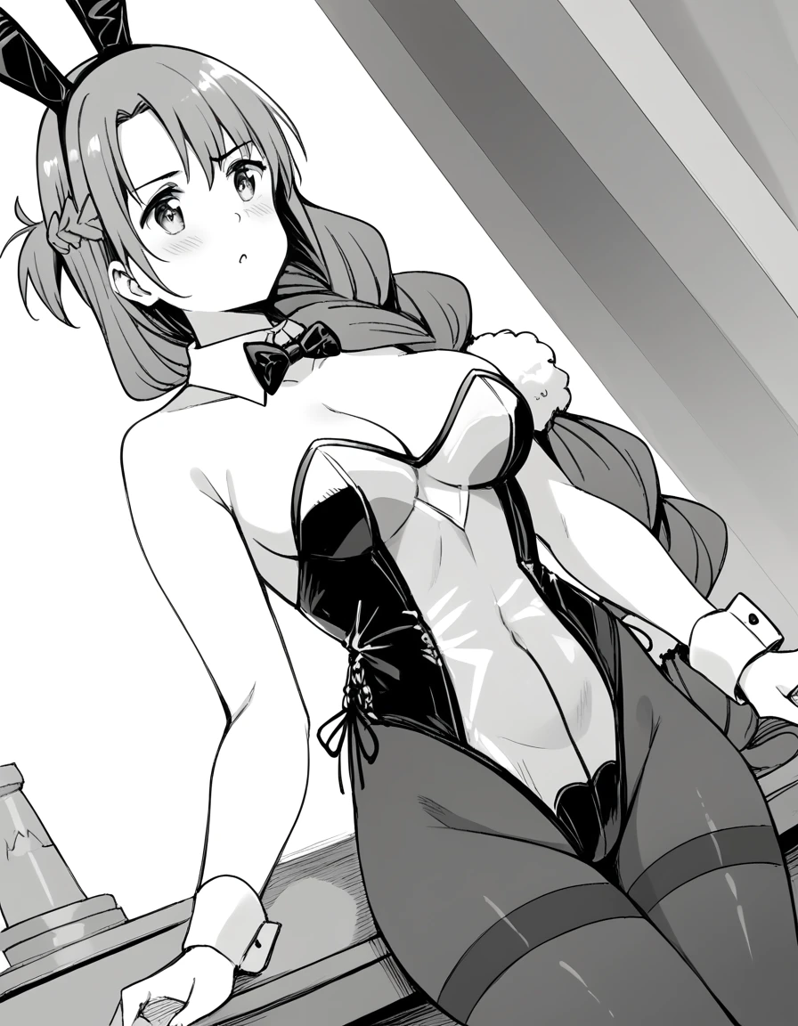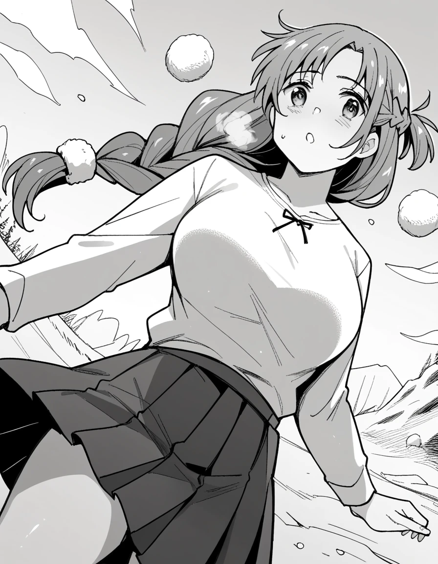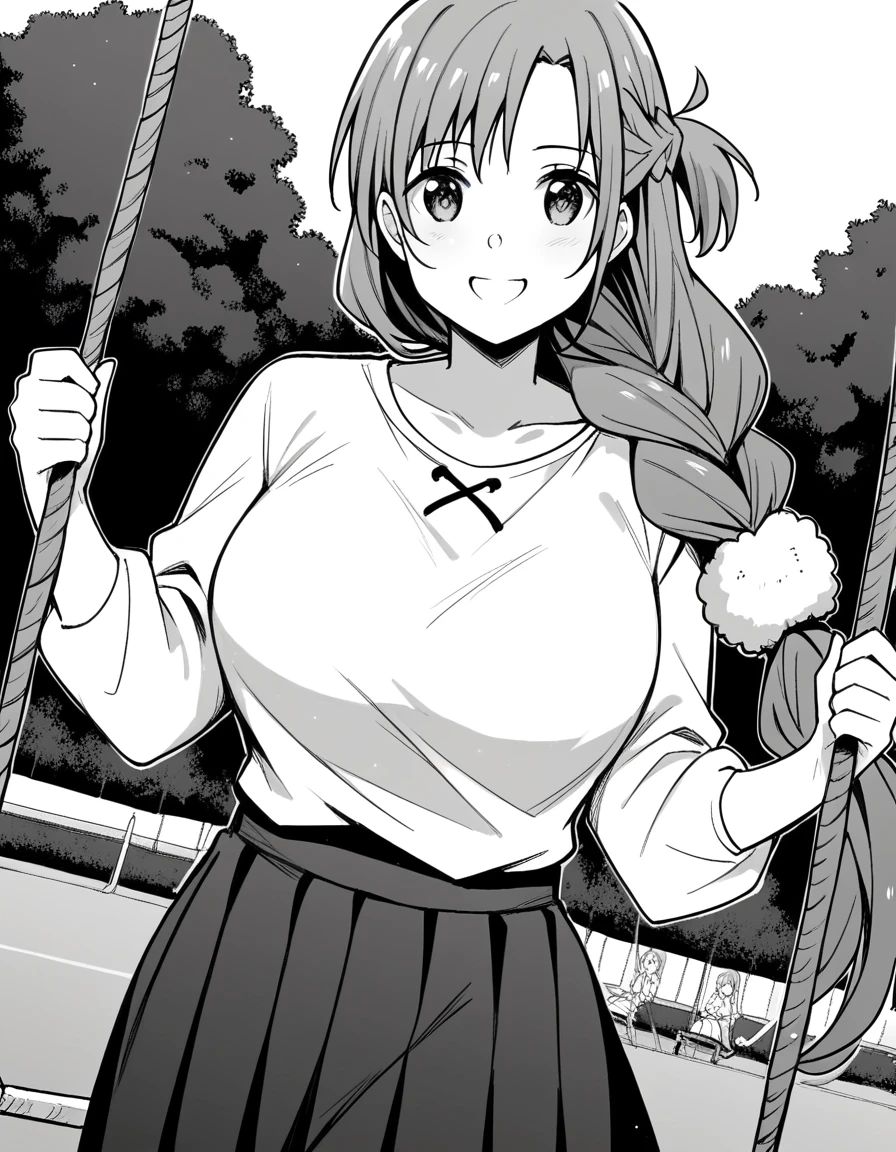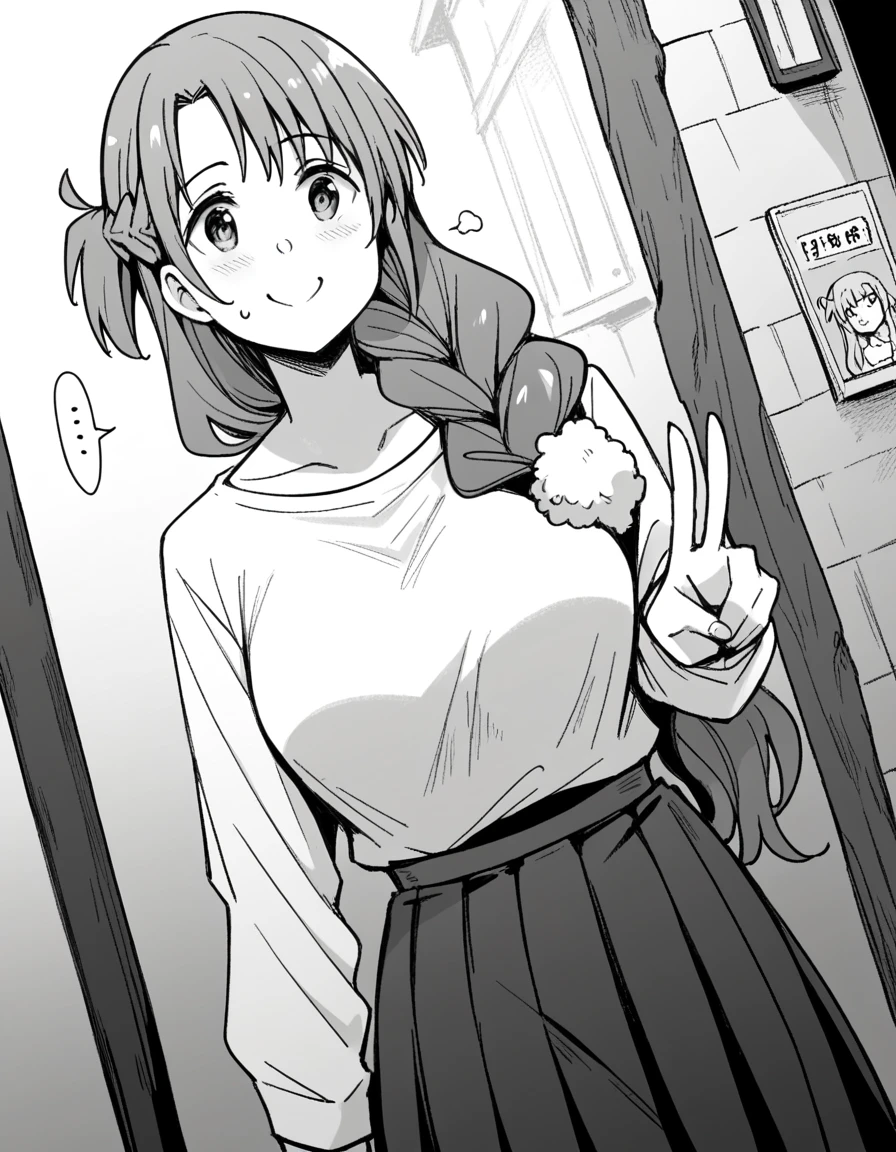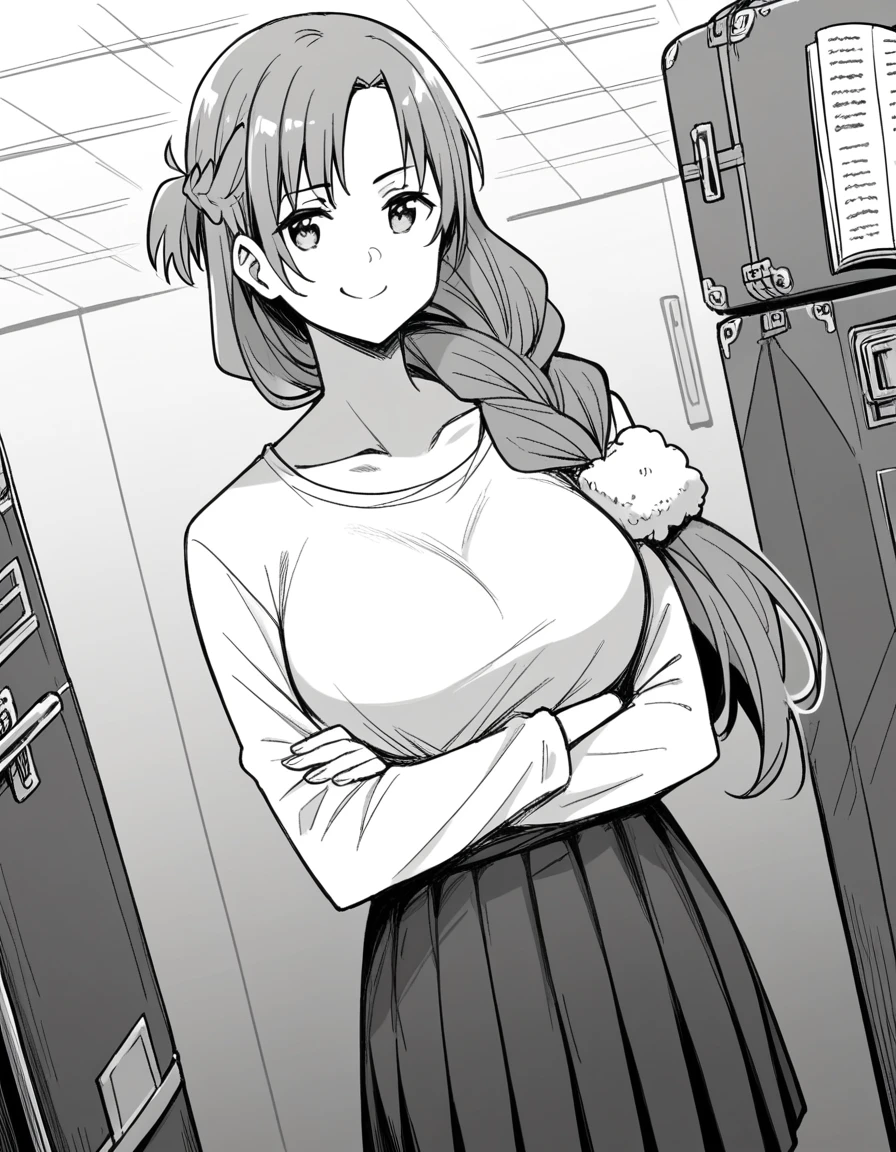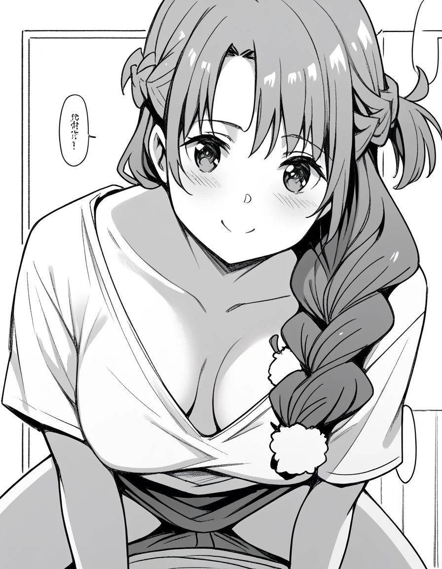 asuna yuuki, long hair, bangs, monochrome, braid, greyscale, single braid, large breasts,