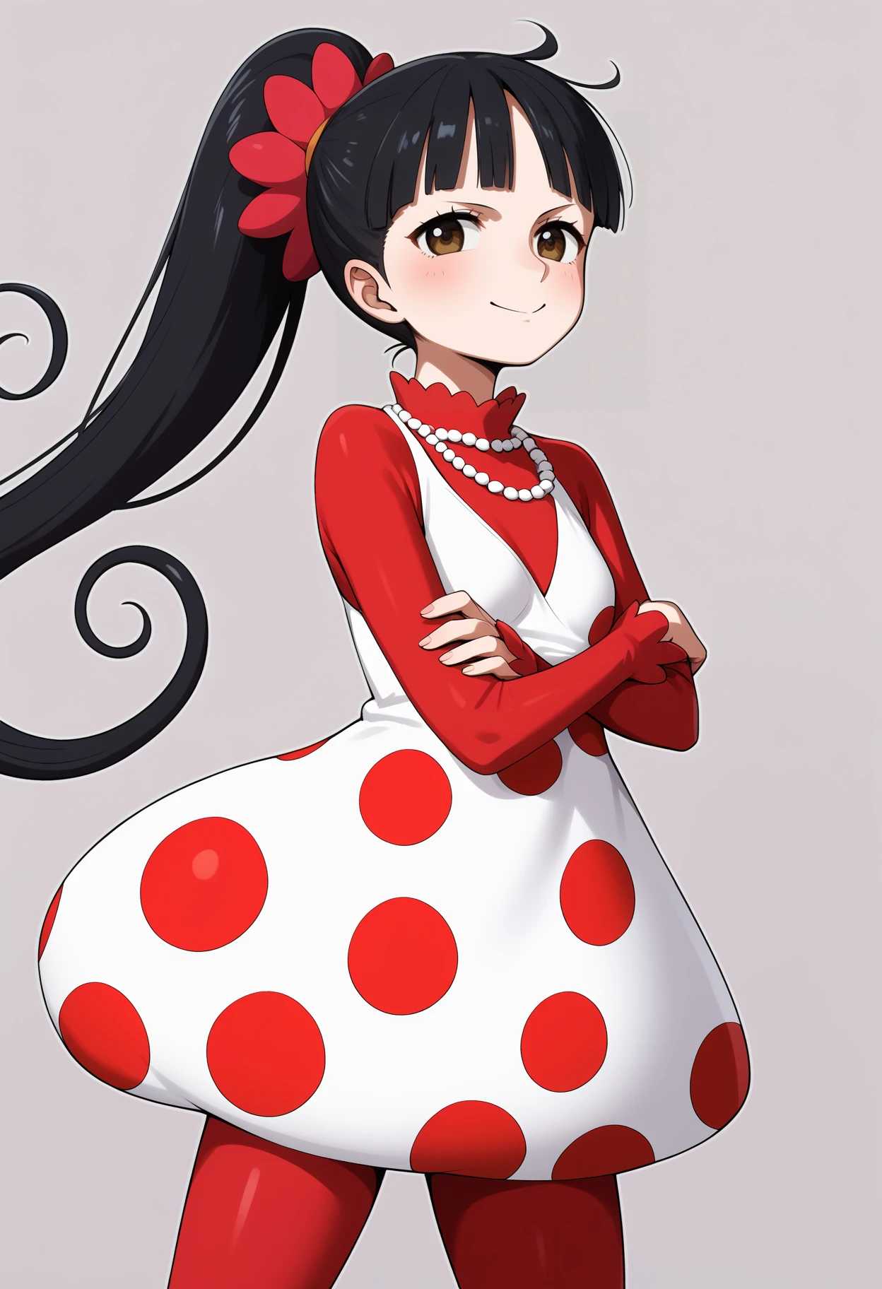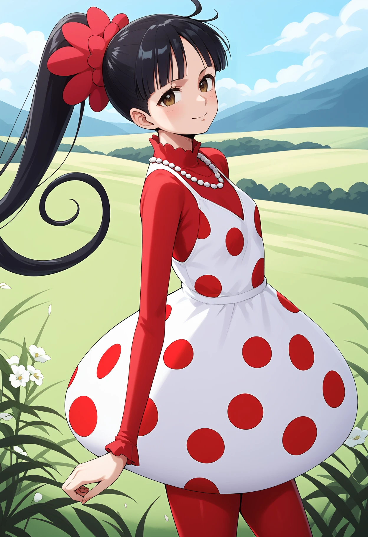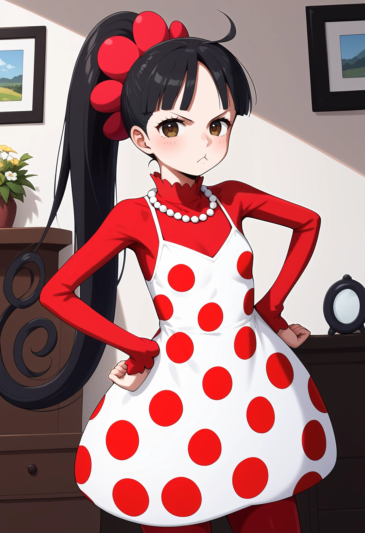 outfit1aaflampe, long hair, black hair, ponytail, brown eyes, small breasts, necklace, red shirt, polka dot dress, white dress, long sleeves, red pantyhose