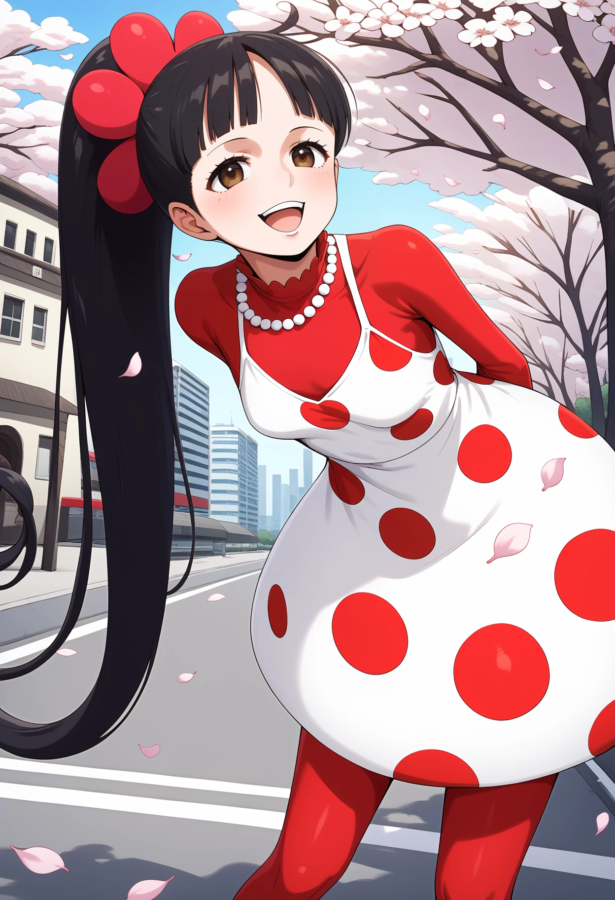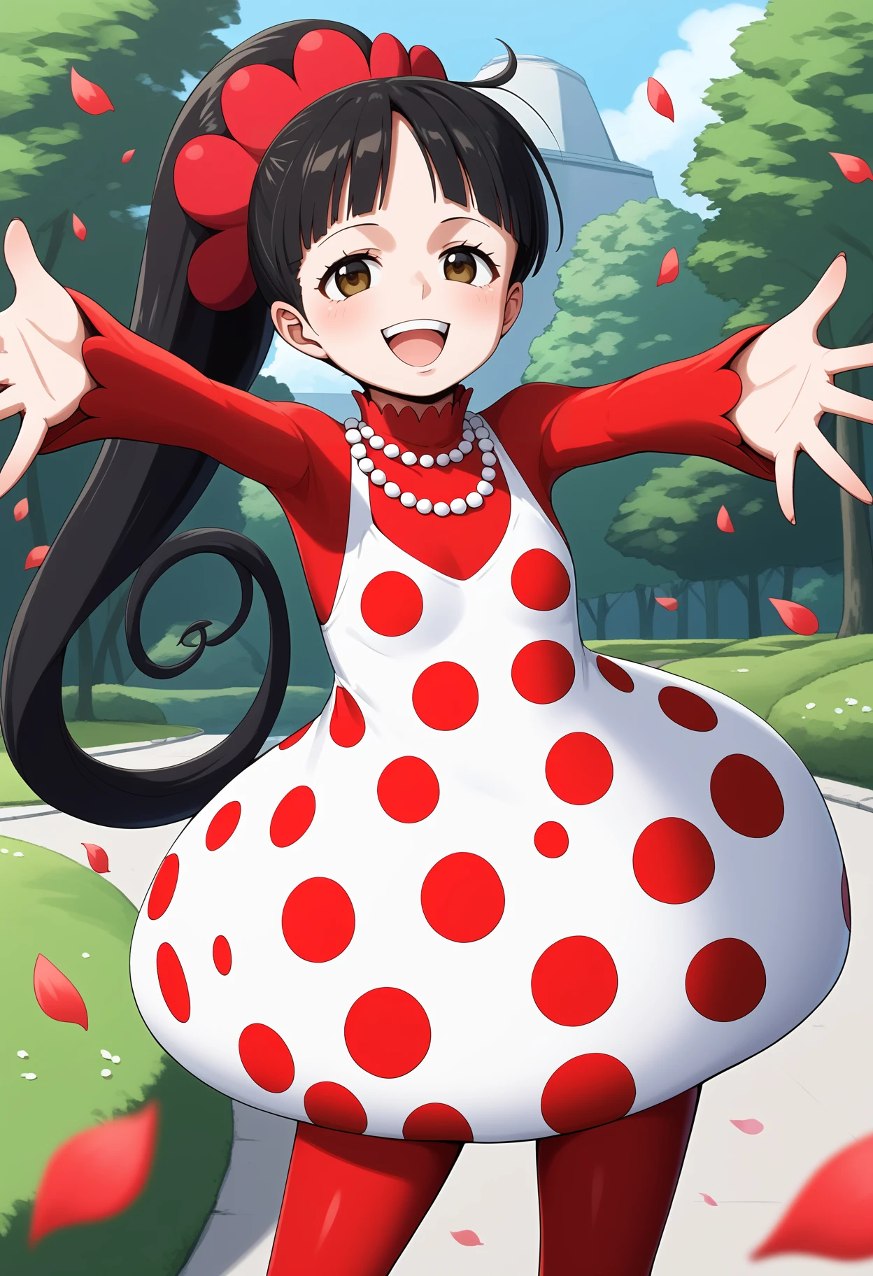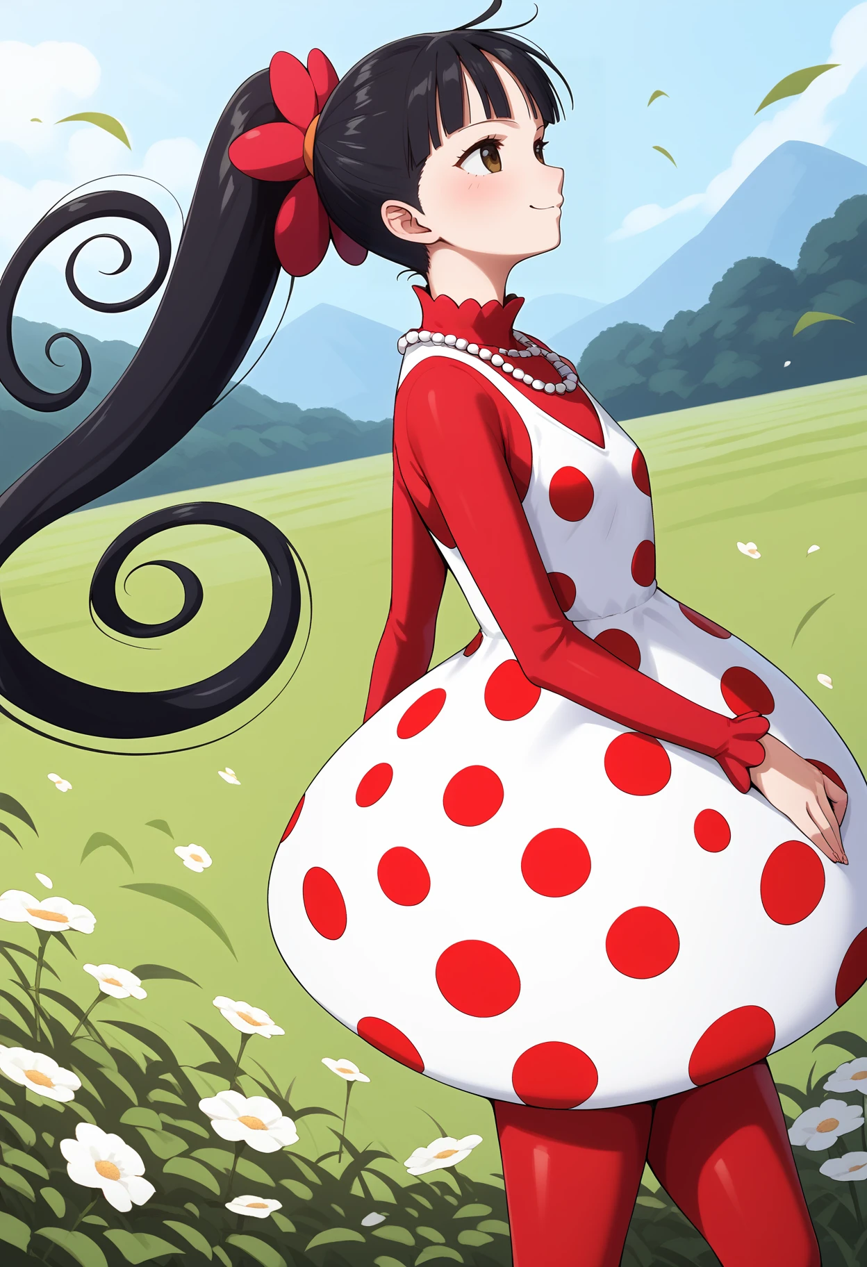 outfit1aaflampe, long hair, black hair, ponytail, brown eyes, small breasts, necklace, red shirt, polka dot dress, white dress, long sleeves, red pantyhose