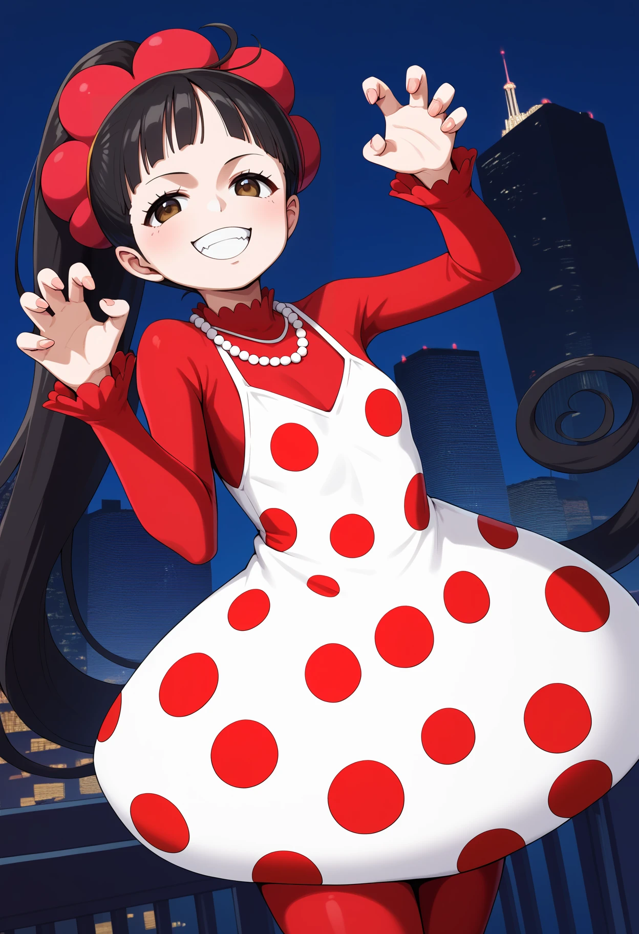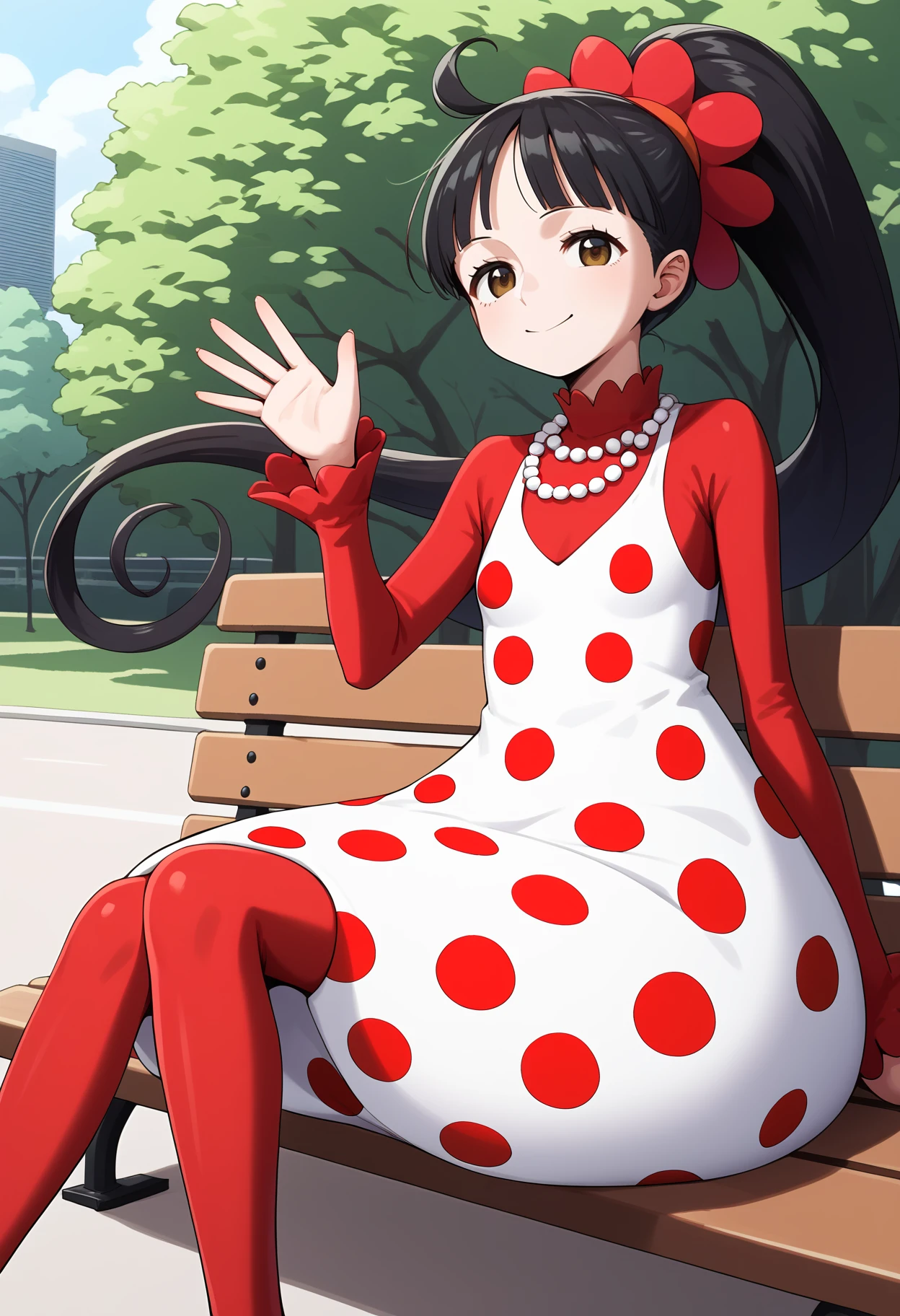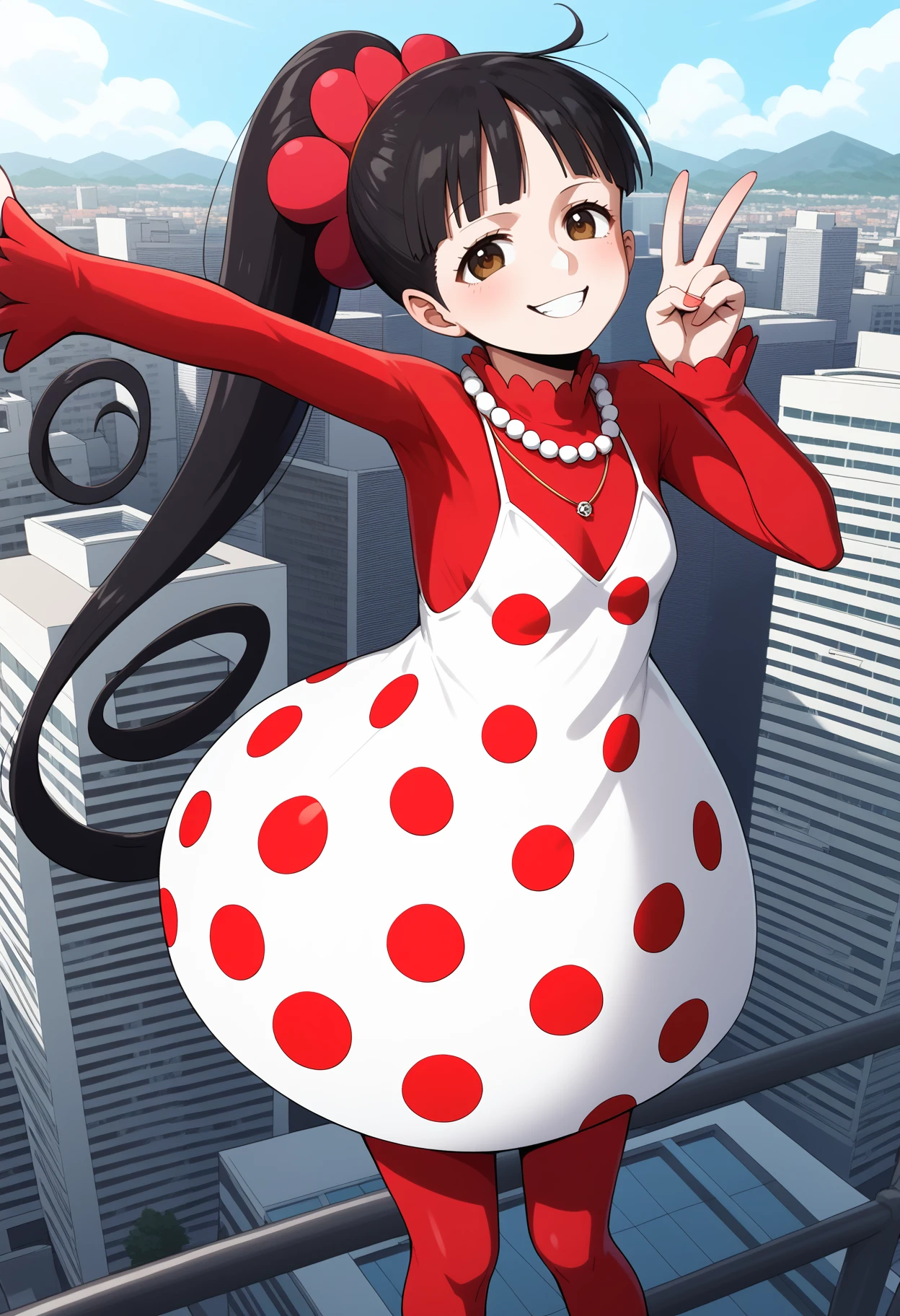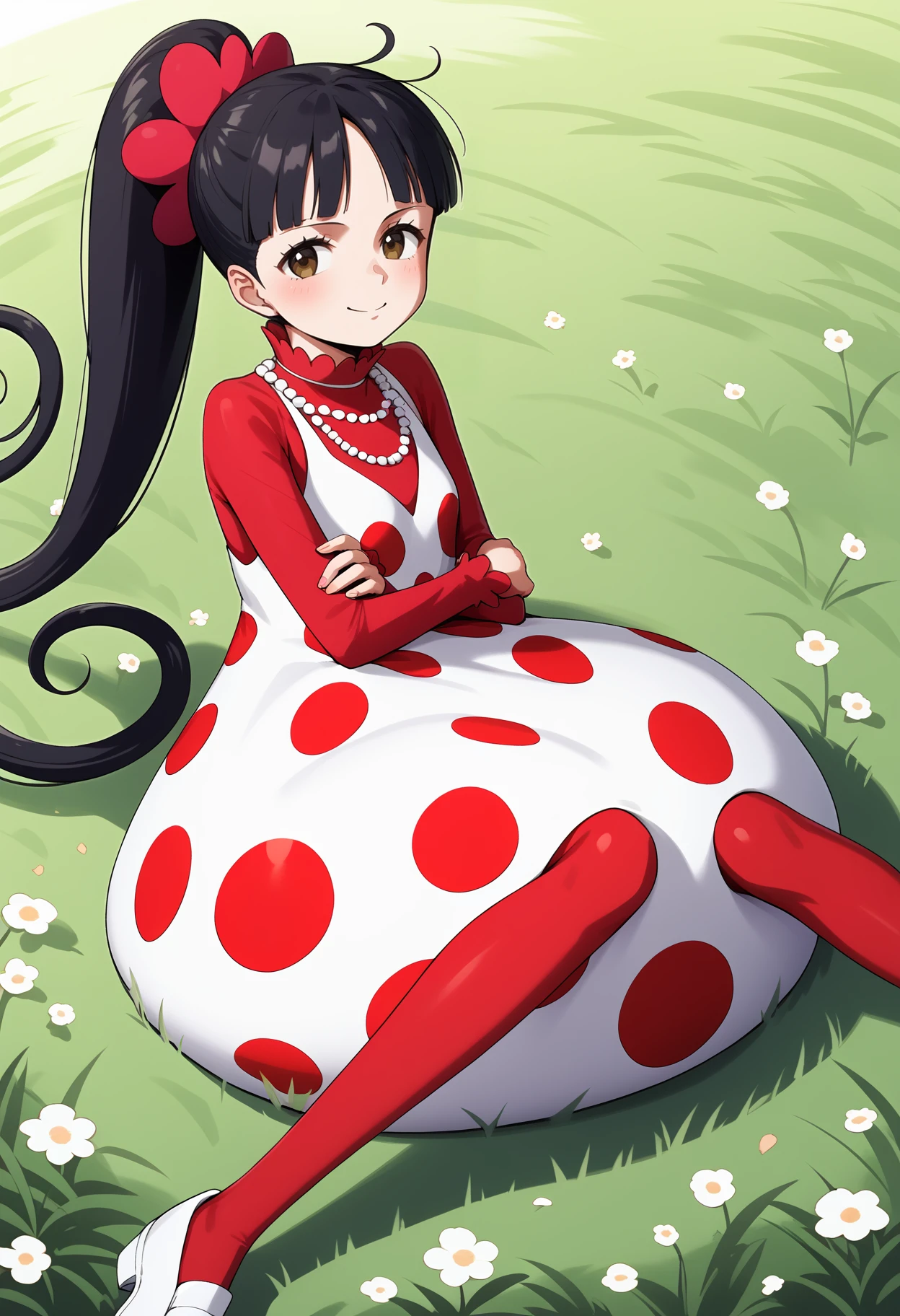 aaflampe, long hair, black hair, ponytail, brown eyes, small breasts, necklace, red shirt, polka dot dress, white dress, long sleeves, red pantyhose