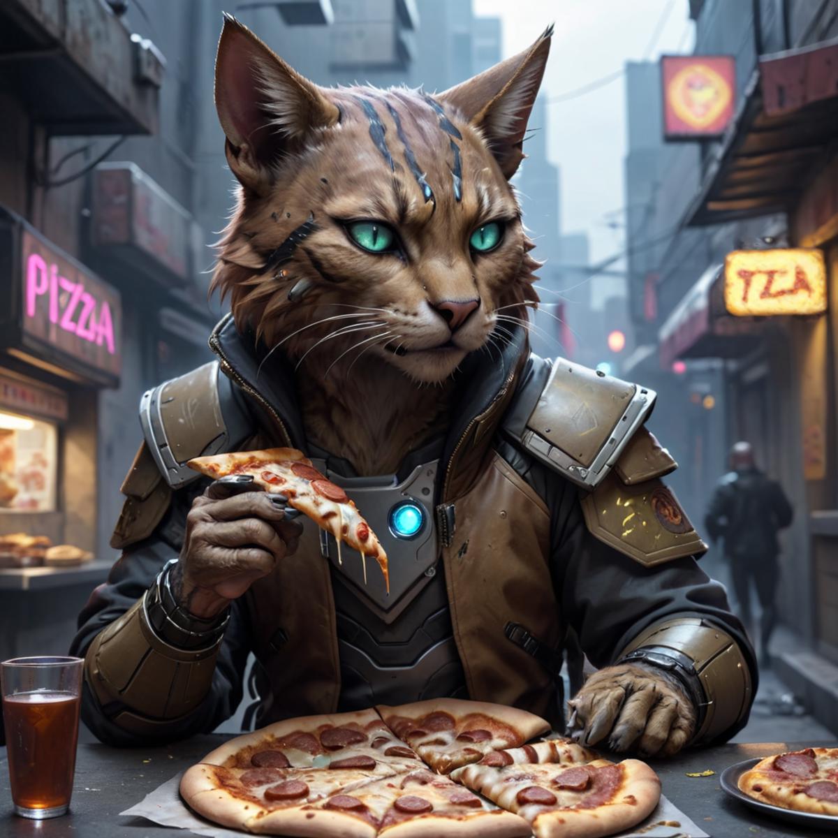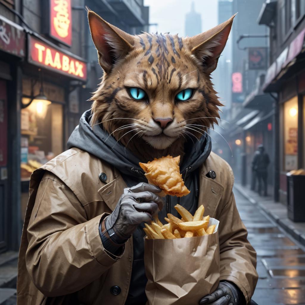 armor, belt, blurry, blurry background, breastplate, cape, chainmail, closed mouth, depth of field, fur trim, gauntlets, gloves, green eyes, holding, holding sword, holding weapon, jewelry, looking at viewer, pauldrons, polearm, rain, realistic, red cape, scabbard, scarf, sheath, sheathed, shoulder armor, sitting, solo, sword, tabaxi, upper body, weapon, weapon on back, yellow eyesDescription