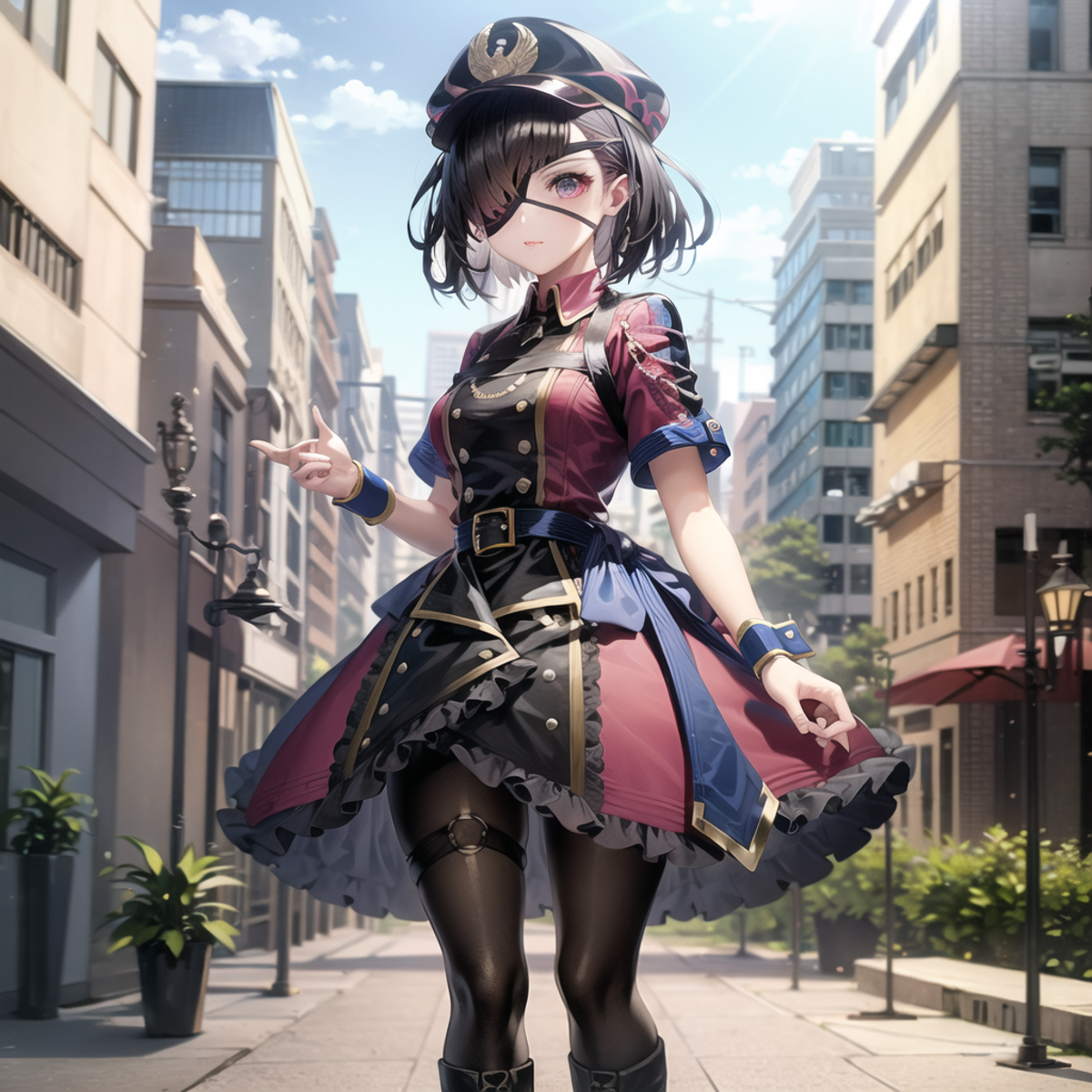a anime character dressed standing,1girl, eyepatch, pantyhose, black hair, wrist cuffs, boots, solo, hat, dress, black pantyhose, short hair, hair over one eye, outdoors, city background, small breast, flat chest,