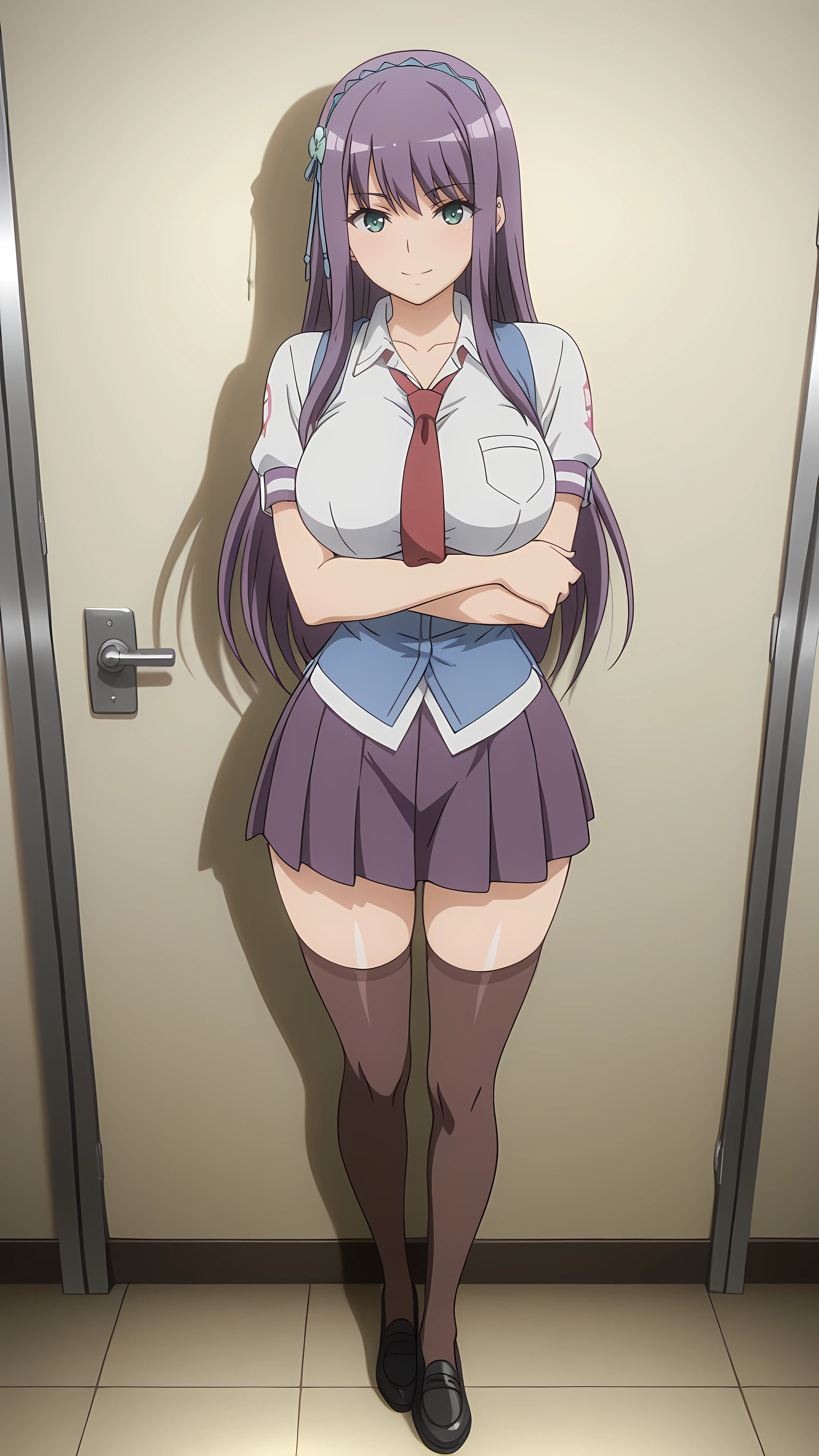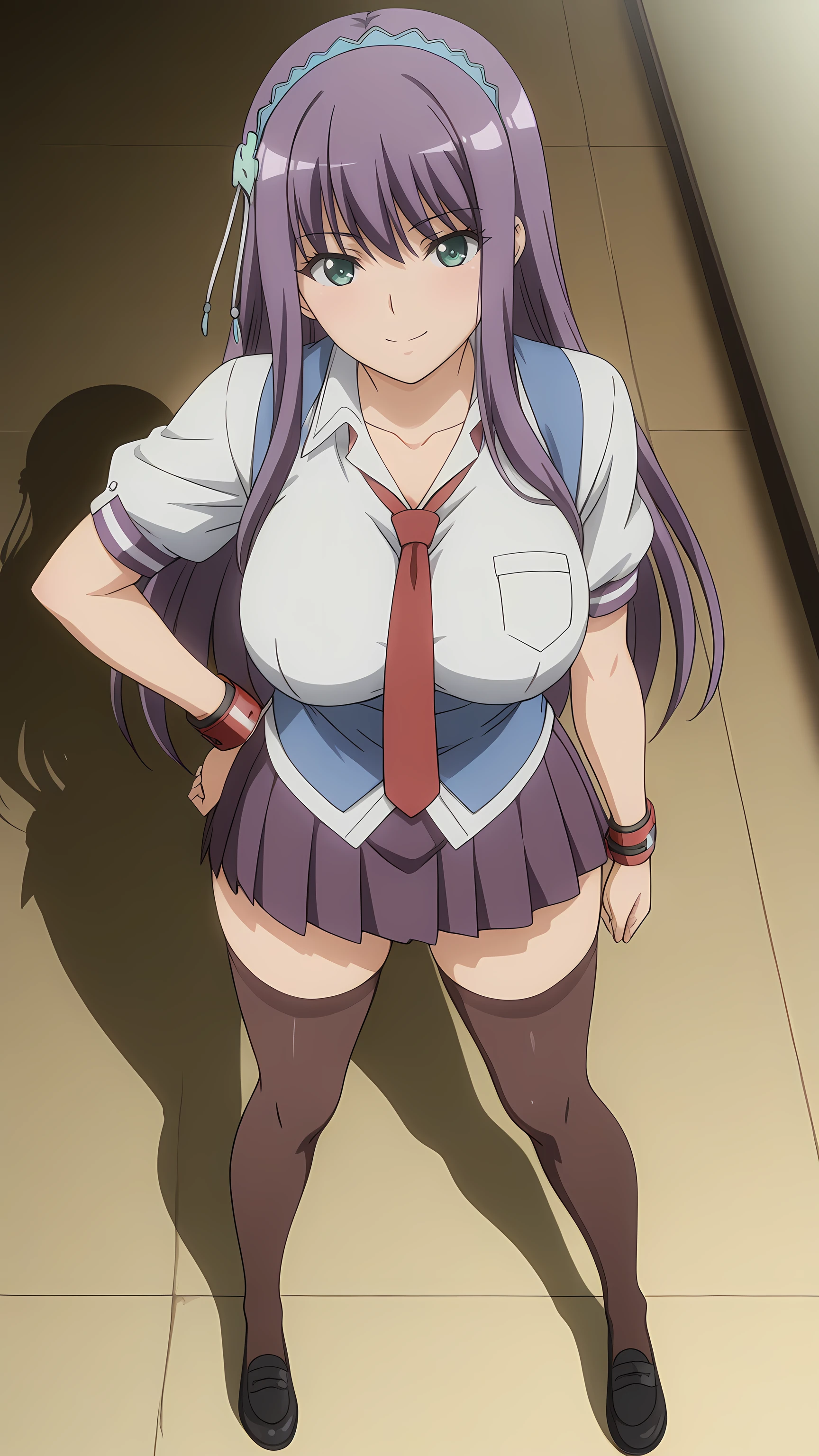 school uniform, thighhighs, purple skirt, necktie, black shoes,