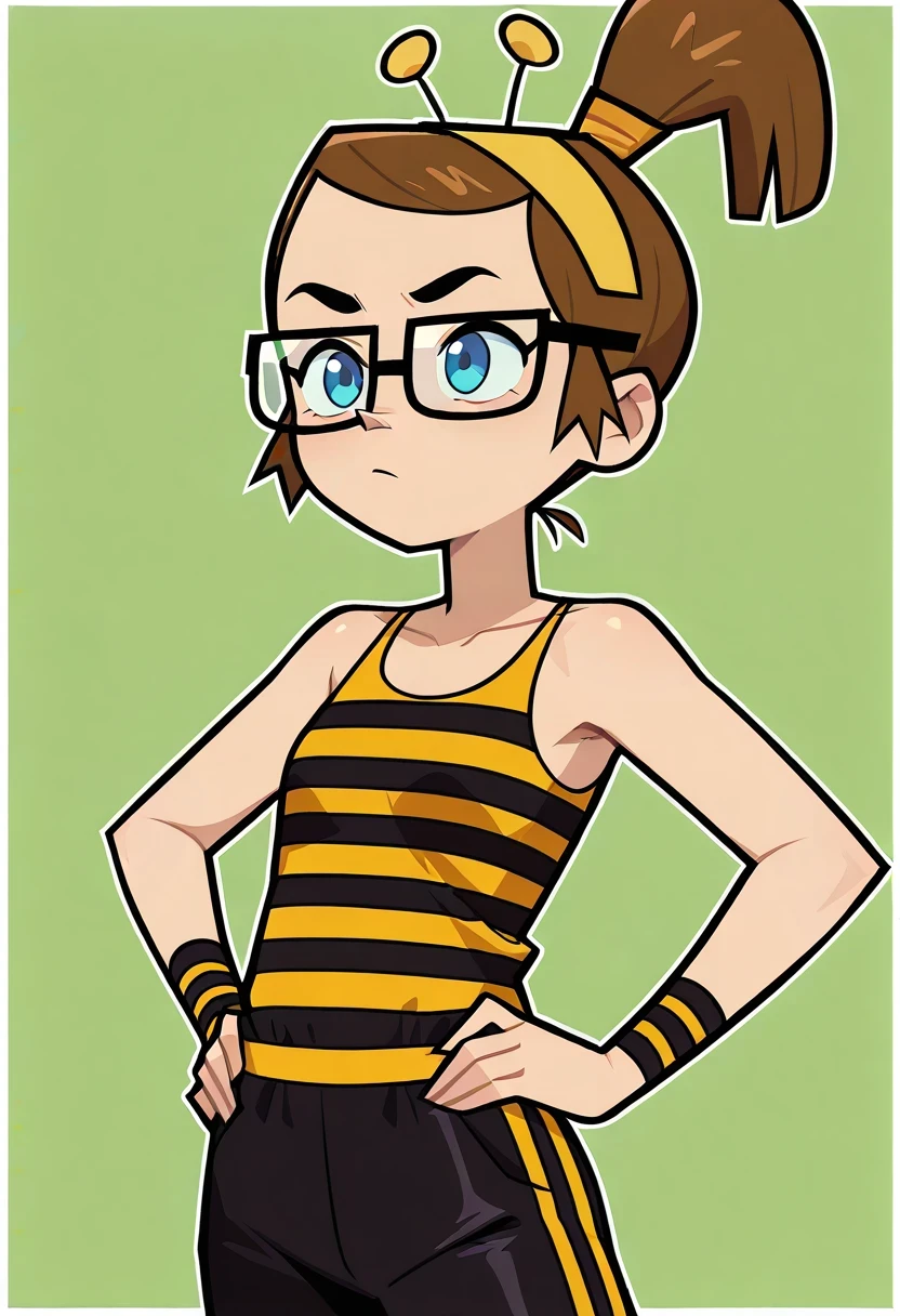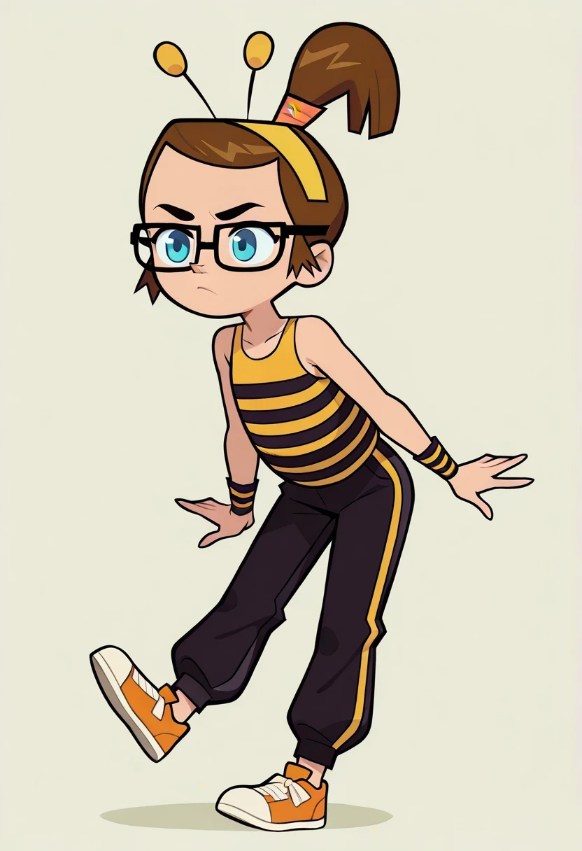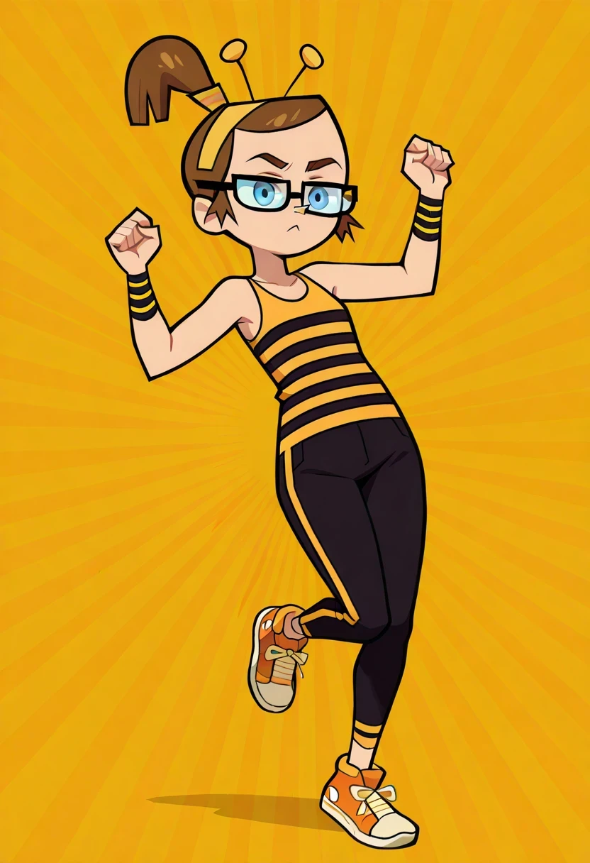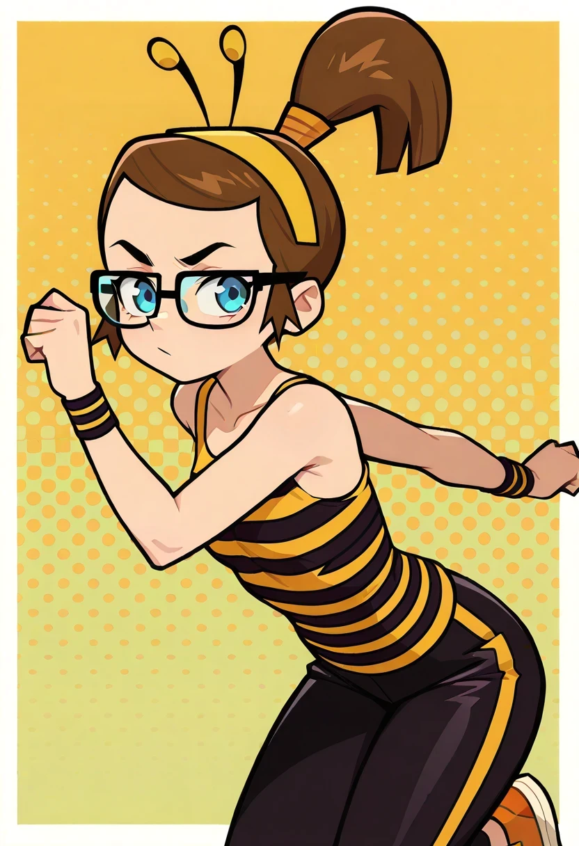 BethTDR, 1girl, blue eyes, black glasses, brown hair, ponytail, bee costume, yellow and black striped tank top, black pants, orange shoes, yellow headband, yellow antennae, black and yellow striped wristbands,