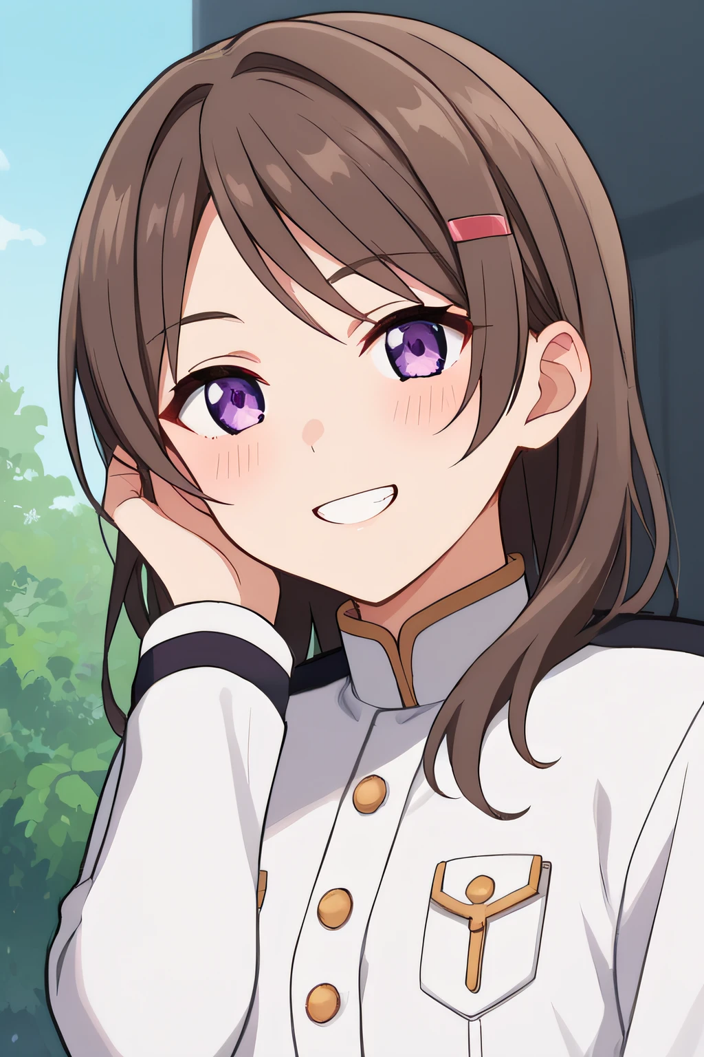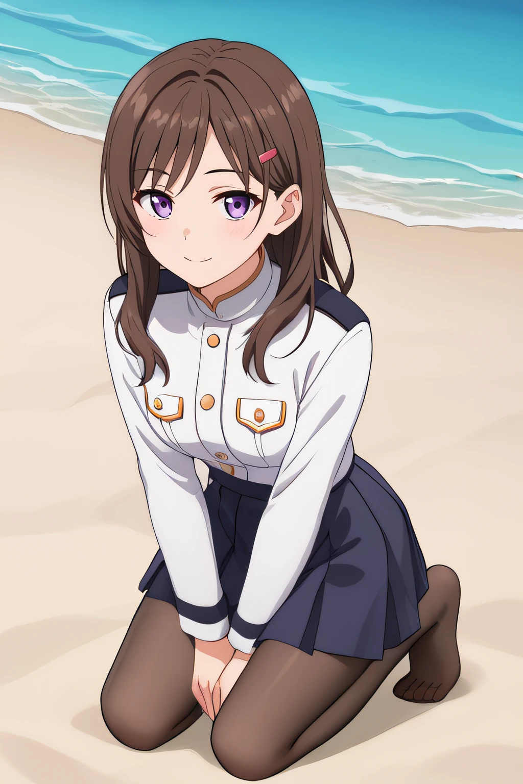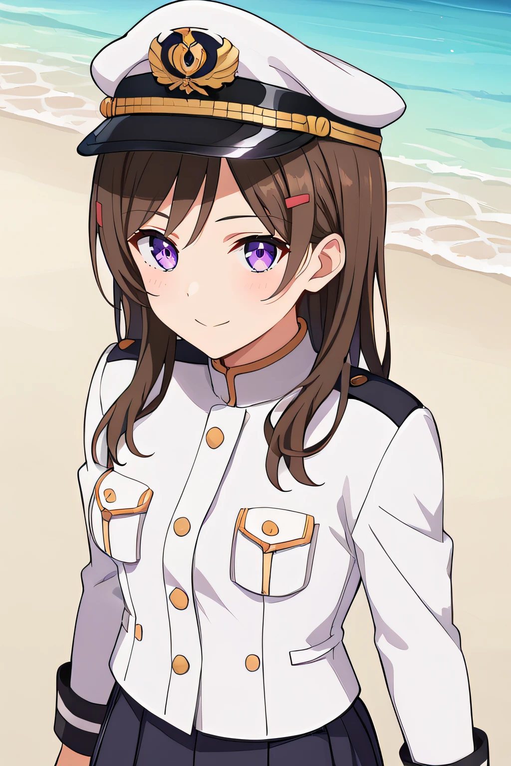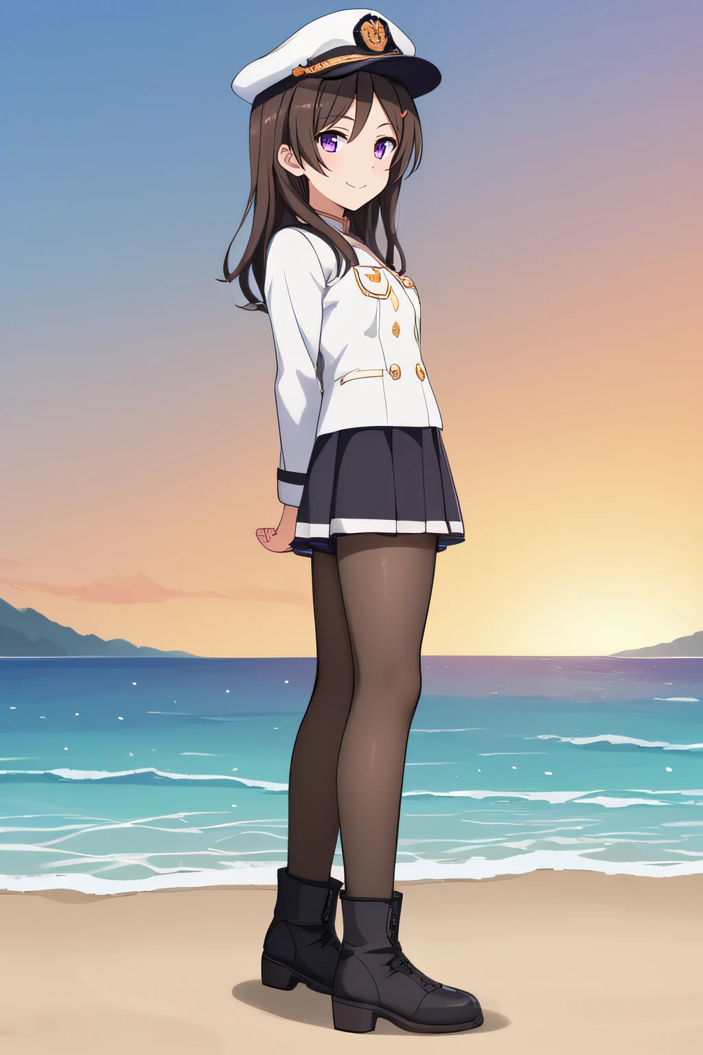moeka, dark brown hair, purple eyes, naval uniform, white peaked cap, long sleeves, pleated skirt, black miniskirt, light black pantyhose